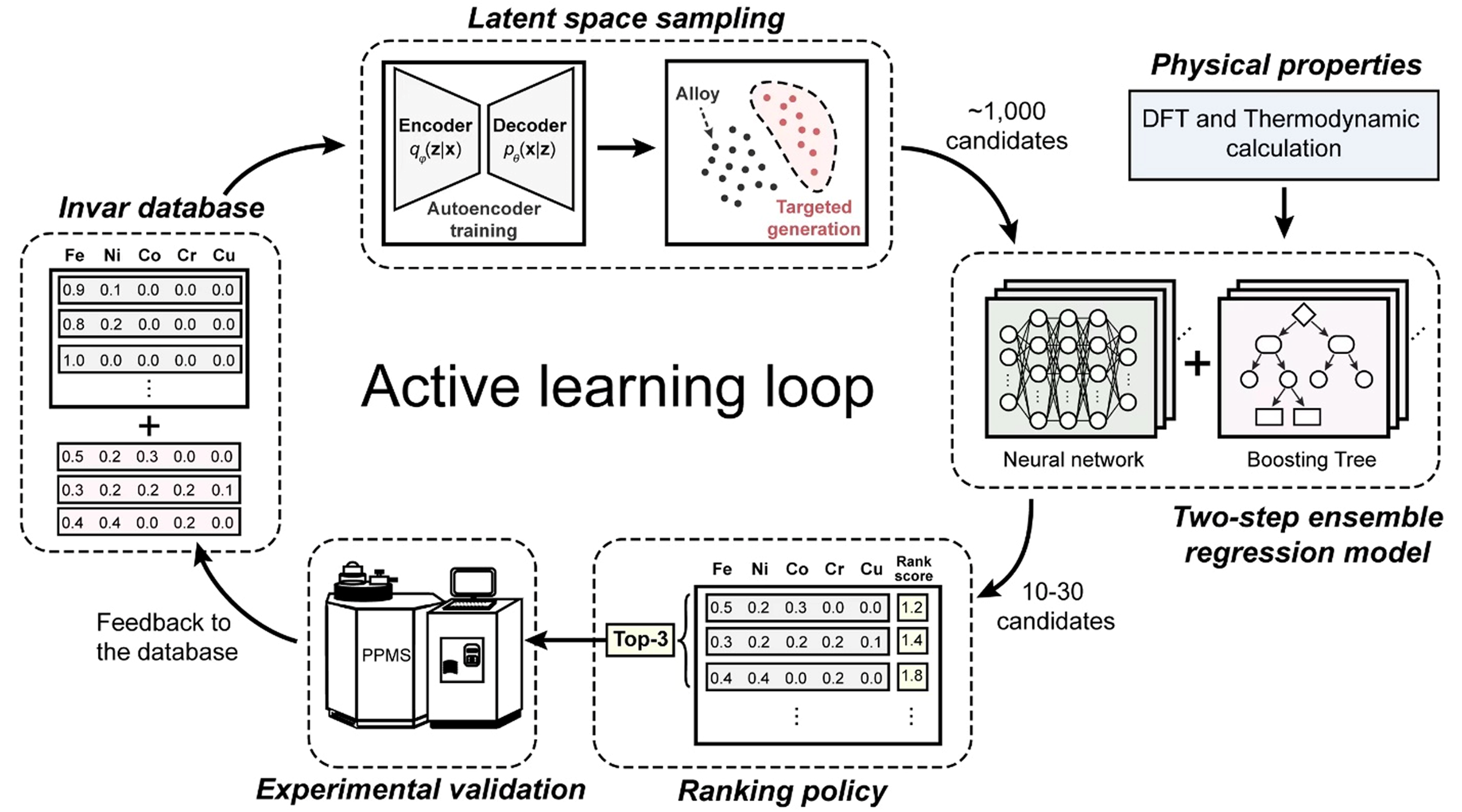 Dieses universelle Framework für aktives maschinelles Lernen hilft, neue Legierungen mit gewünschten Eigenschaften schneller und kostengünstiger zu identifizieren. Das Framework wurde erfolgreich bei der Entdeckung neuer Invar-Legierungen mit speziellen Wärmeausdehnungseigenschaften angewendet. Diese Legierungen bestehen aus Eisen und Nickel und dehnen sich nicht aus beziehungsweise ziehen sich nicht zusammen, wenn sich die Temperatur ändert. Ihr idealer Einsatzbereich sind Behälter zur Speicherung von flüssigem Wasserstoff, Ammoniak und Erdgas bei Temperaturen zwischen -160 °C und Raumtemperatur. „Invar-Legierungen vorherzusagen ist rechnerisch ein sehr anspruchsvolles Problem, weil verschiedene Faktoren wie Magnetismus und Gitterschwingungen miteinander wechselwirken und die thermische Ausdehnung beeinflussen. Die Entdeckung neuer Invar-Legierungen ist deshalb ein hervorragender Beweis für unsere Berechnungen ebenso wie für das entwickelte Framework für aktives Lernen“, sagt Dr. Fritz Körmann, Forschungsgruppenleiter an der Universität Delft sowie am MPIE und Mitautor der Publikation. Das von den Wissenschaftlern entwickelte Framework für aktives Lernen umfasst drei grundlegende Schritte. Zuerst werden vielversprechende Legierungszusammensetzungen auf Basis eines tiefen generativen Modells gefunden, das unüberwachtes Lernen mit zufälligen (stochastischen) Stichproben kombiniert. Im nächsten Schritt werden diese Zusammensetzungen mithilfe eines zweistufigen Regressionsmodells überprüft, nach dem etwa 20 vorgeschlagene Zusammensetzungen übrigbleiben. Von diesen Zusammensetzungen wird eine Rangfolge ermittelt, und die drei besten Kandidaten werden experimentell verarbeitet und charakterisiert. „Wir führen die Modell-Vorhersagen, die theoretischen Berechnungen und die experimentelle Überprüfung in einem zirkulären Framework zusammen, und in nur sechs Iterationen haben wir erfolgreich zwei finale neuartige Invar-Legierungen mit verbesserten thermischen Ausdehnungseigenschaften identifiziert“, sagt Prof. Hongbin Zhang von der Technischen Universität Darmstadt und Mitautor der Publikation.