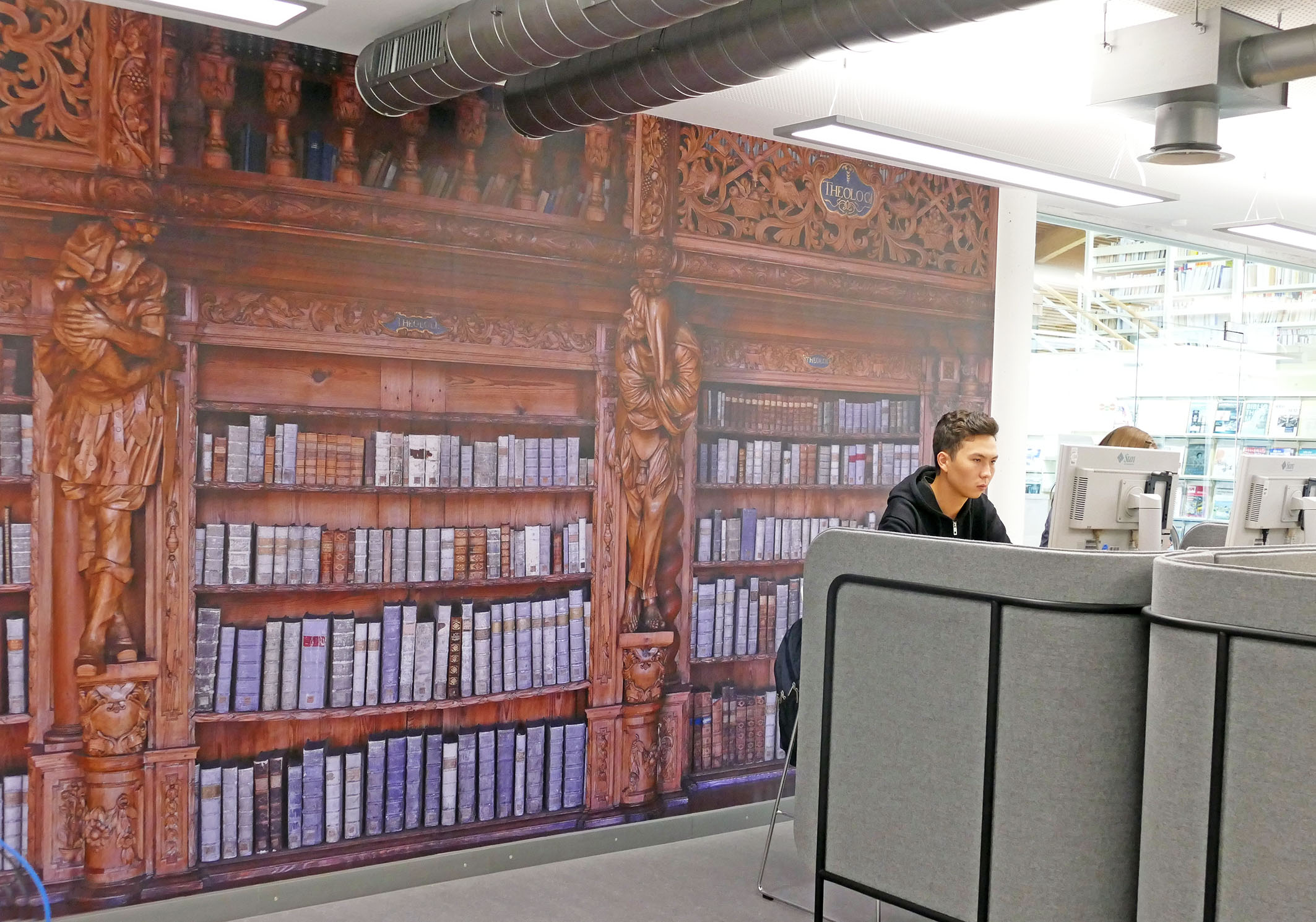 Es sind keine digital dark ages zu befürchten: Das Wissen bleibt, die Angebote und Techniken ändern sich. Der Eingangsbereich der Bibliothek am Hochschul-Standort in Schweinfurt ist umgebaut und den neuen Erfordernissen angepasst worden. Mit einer Finanzierung von 150.000 Euro ist die Bibliothek für Studierende, Schülerinnen und Schüler sowie Mitarbeitende der Hochschule jetzt „loungiger“, kommunikativer und moderner geworden. Boden, Belüftung, Beleuchtung und eine neue Schalltechnik laden Bibliotheksbesuchende ebenso zum Arbeiten, Lesen, Lernen, Verweilen und Nachdenken ein wie die EDV-Arbeitsplätze inklusive USB- und Stromtanks. Eine neue Theke mit Sichtschutz und höhenverstellbaren Tischplatten erleichtern das Arbeiten der Bibliotheksmitarbeitenden. Als Highlight begrüßt sie darüber hinaus eine sechs mal drei Meter große Fototapete, die einen Ausschnitt der Stiftsbibliothek zu Waldsassen zeigt. Sie gibt einen Blick auf Bibliotheken als Wissensspeicher durch die Jahrhunderte. Als einzige allgemeine wissenschaftliche Bibliothek in Schweinfurt ist sie für alle Bürgerinnen und Bürger aus Stadt und Region zugänglich.
