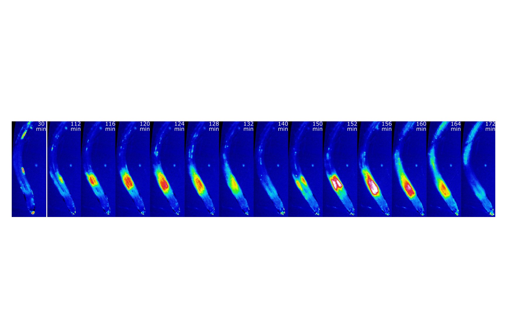Arabidopsis seedlings have been exposed to manganese deficiency, and cytosolic calcium dynamics have been visualized utilizing the GCaMP6f-mCherry calcium biosensor. The calcium dynamics in roots are presented as false color images for selected timepoints after onset of manganese deficiency (from left).