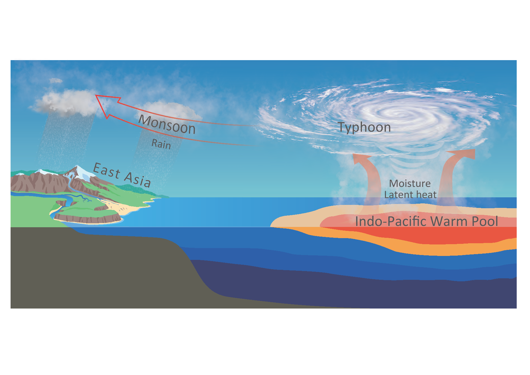 Das Indo-Pazifische Wärmebecken (IPWP) spielt eine entscheidende Rolle für das globale Klima, indem es enorme Mengen an Wasserdampf und latente Wärme an die Atmosphäre abgibt und so das Klima reguliert. In jüngster Zeit haben stetig wärmer werdende Ozeane dazu beigetragen, dass tropische Stürme verstärkt und intensiver werden – sie beziehen ihre Energie direkt von der Oberfläche des Meeres. Wie genau Ozeanerwärmung und Niederschlägen an Land zusammenhängen, ist jedoch noch nicht ausreichend erforscht. Fest steht aber, dass Ozeane die anthropogene Klimaerwärmung nur bis zu einem bestimmten Sättigungsgrad durch Aufnahme ausgleichen können.