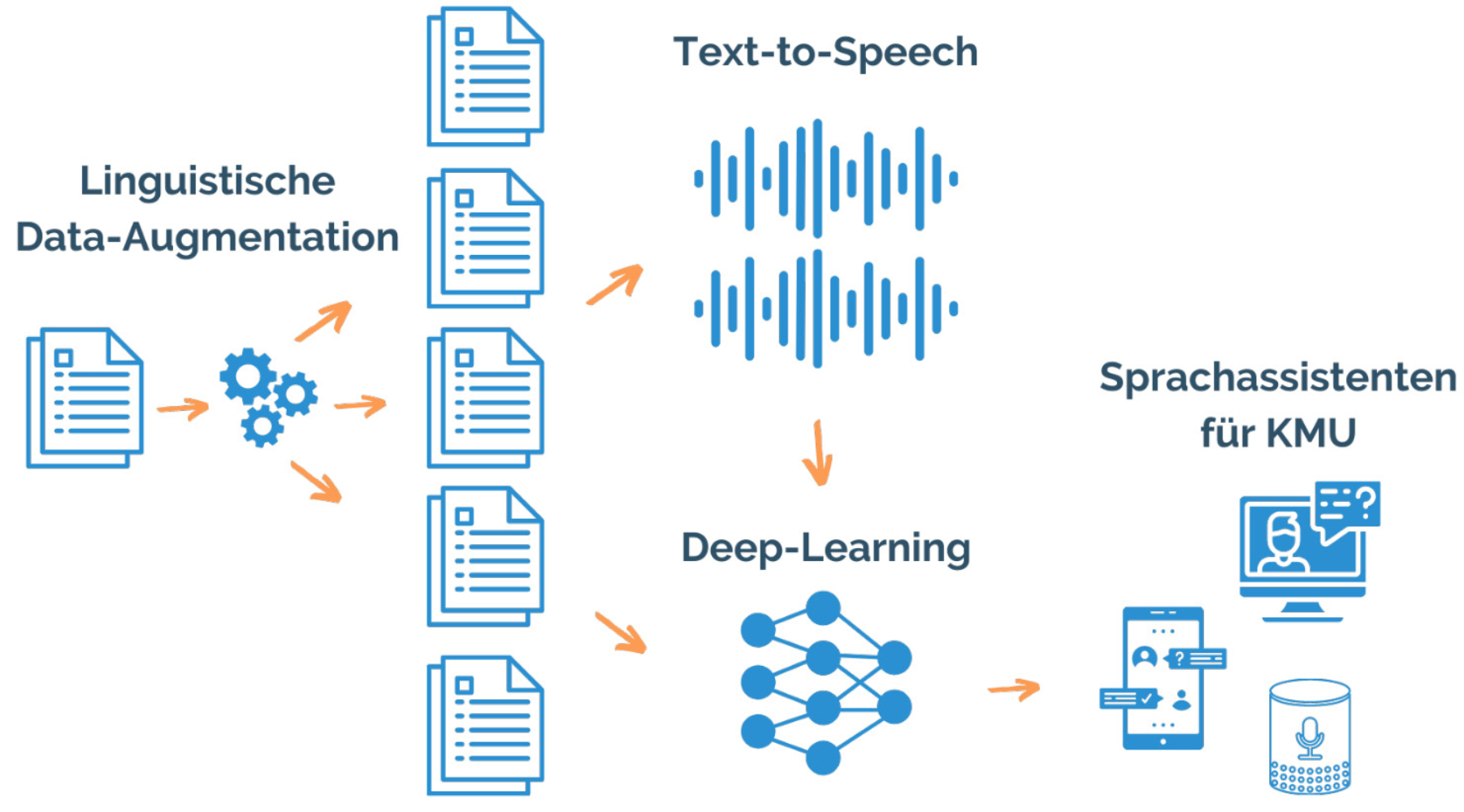 Das ist schön für die Nutzer dieser Systeme und natürlich für die riesigen Tech-Firmen. Aber was ist mit den unzähligen kleinen und mittelständischen Unternehmen (KMU), die diese riesige Menge an Trainingsdaten nicht zur Verfügung haben? Ihnen droht, im Wettbewerb mit den Großen die Luft auszugehen. Denn entweder müssen sie teuer das Know-how der großen Anbieter einkaufen oder sie müssen mit großer Mühe und ebenfalls viel Geld Trainingsdaten zusammenbekommen und ein eigenes Sprachdialogsystem entwickeln. Denn bei der Entwicklung eines KI-basierten Sprachdialogsystems gilt nach wie vor oft das simple Prinzip: Viel hilft viel. Man braucht viele Kundengespräche, um zum Beispiel einen guten Chatbot zu programmieren. Kleinere Unternehmen müssten also Call Center aufbauen und massenhaft Kundendialoge aufzeichnen, verschriften und damit dann eine KI trainieren. Das ist meist finanziell und organisatorisch nicht machbar.