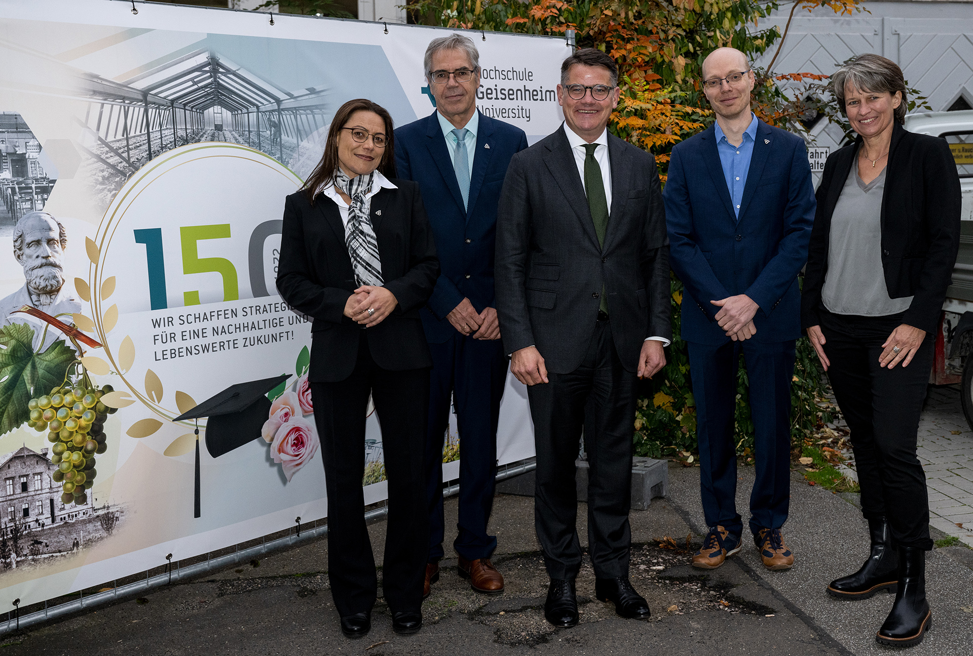 Gemeinsam mit Hessens Ministerpräsident Boris Rhein, Ayse Asar, Staatssekretärin im Hessischen Ministerium für Wissenschaft und Kunst (HMWK), sowie weiteren Vertreterinnen und Vertretern aus Politik, Verbänden und Hochschulgemeinschaft beging die Hochschule Geisenheim Mitte Oktober in einer Akademischen Feier den 150. Geburtstag ihres Lehr- und Forschungsstandorts. Die Hochschulleitung warf dabei ein Schlaglicht auf die gegenwärtigen und zukünftigen Herausforderungen der grünen Branche, der Lebensmittel- und Getränkeindustrie.