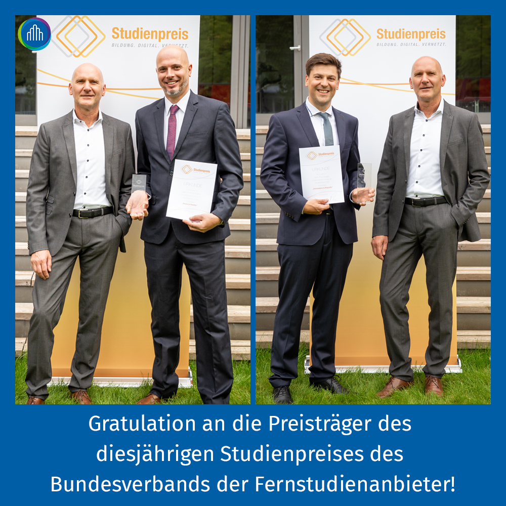 Herzliche Gratulation an unsere Absolventen Thomas Füldner und Timo Grieger! Als wäre der erfolgreiche Studienabschluss nicht schon Grund genug zur Freude – nun wurden die beiden auch noch verdient mit dem Studienpreis 2022 des Bundesverbands der Fernstudienanbieter ausgezeichnet. Thomas Füldner in der Kategorie „Praxis & Transfer“, Timo Grieger in der Kategorie „Fernstudium & Biografie“.