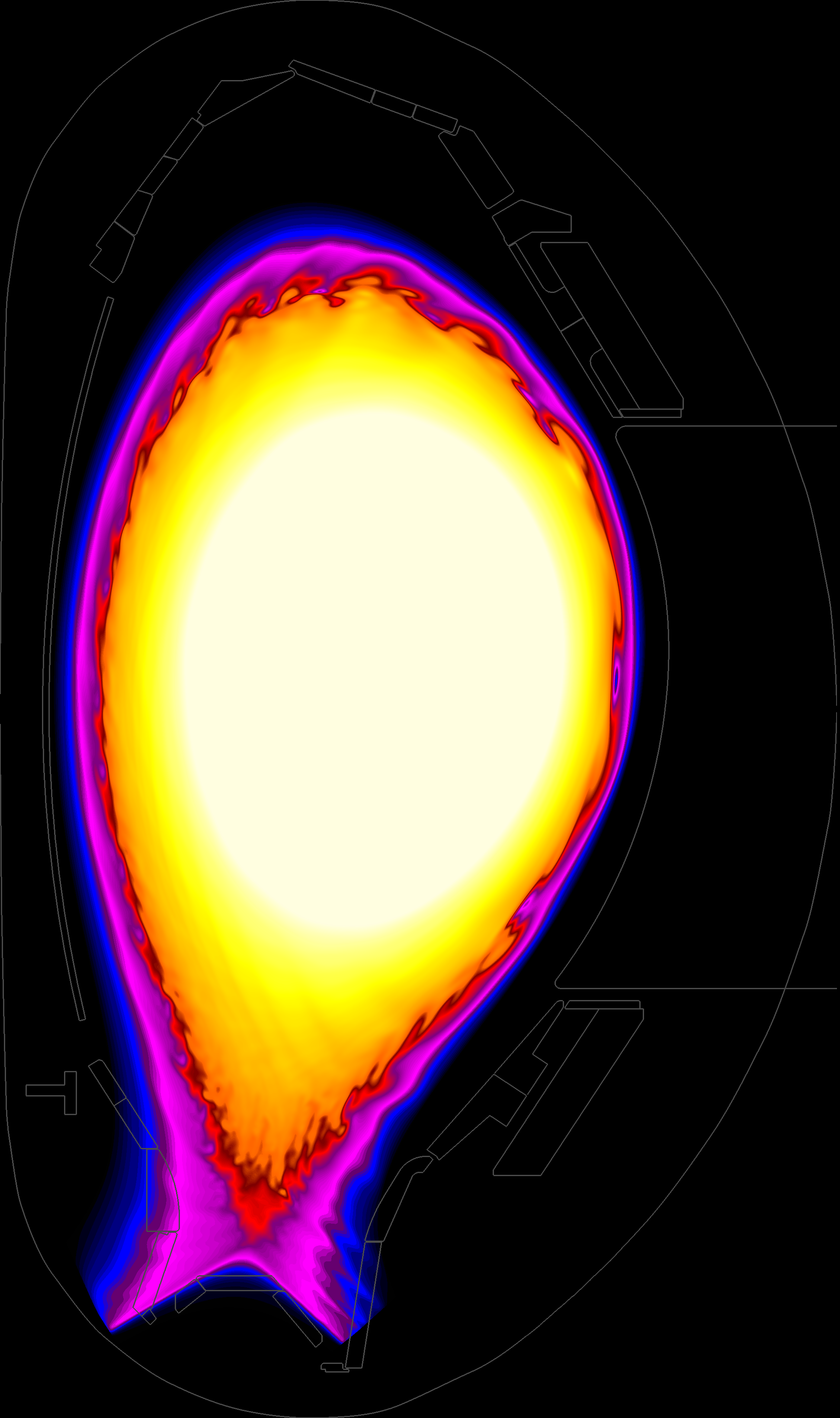 Computer simulation of a Type I ELM lasting 500 microseconds. The image shows a cross-section through the donut-shaped vacuum vessel of a tokamak. Recurrent eruptions form at the edge of the fusion plasma at regular intervals. These ELMs occur when the plasma is operated in the H-mode. The figure is based on calculations with the code JOREK in the publication of A. Cathey et al 2020 Nucl. Fusion 60 124007