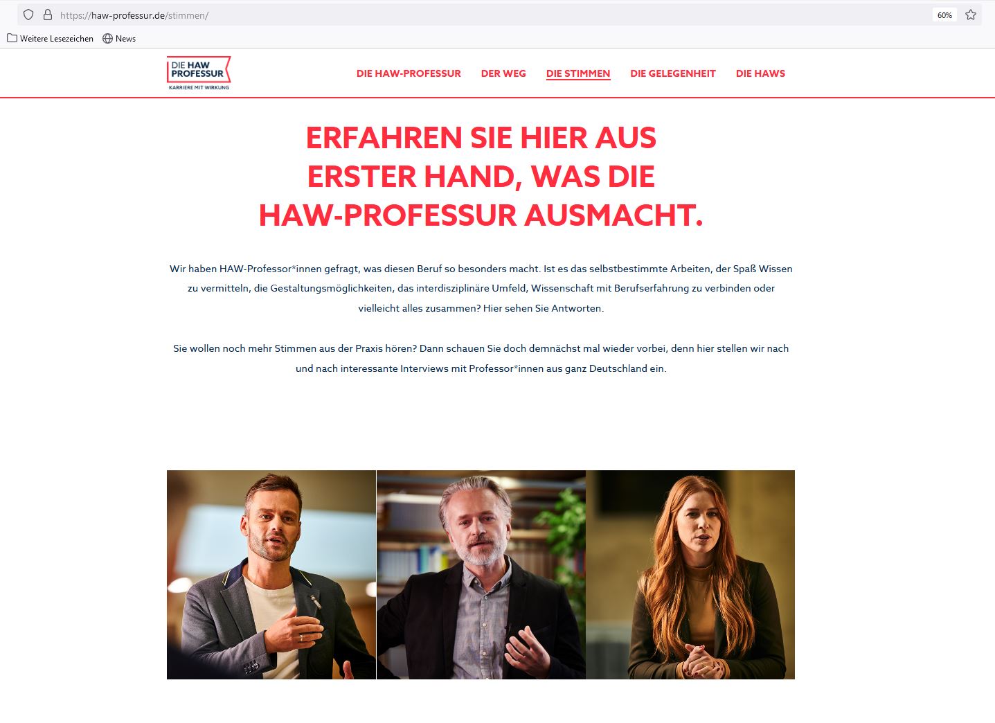 Nukleus der Kampagne ist eine Website, die als Anlaufpunkt für alle fungiert, die sich von selbst oder durch die Ansprache der Kampagne für das Thema HAW-Professur interessieren. Testimonials von Professor*innen unterschiedlicher HAW-Standorte, die das breite Spektrum an Fächern an HAWs, aber auch an Persönlichkeiten abbilden, die bereits den Karriereschritt zur HAW-Professur gegangen sind und an HAWs forschen und lehren, geben mit Bildern, in Videos und mit Statements der Kampagne und dem Berufsbild ein lebendiges Gesicht.
