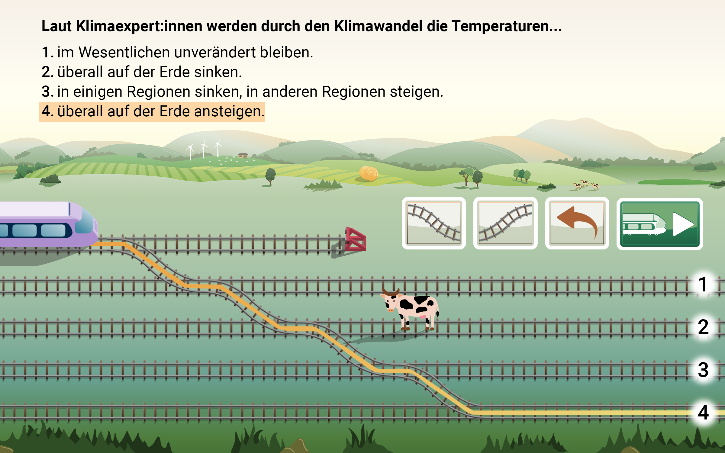 Jeder und jede Teilnehmende wählt einen virtuellen Zug im Spiel und setzt ihn auf die Schienen. Dann beantworten die Spielenden Fragen, indem sie neue Gleise legen und Hindernisse umfahren. Zunächst gibt es ein paar Wissensfragen, dann geht es weiter zu persönlichen Einstellungen und Handlungsentscheidungen. Beispielsweise gilt es einzuschätzen, inwieweit der Klimawandel die Spielenden selbst überhaupt betrifft und für wie dringlich Maßnahmen zum Klimaschutz gehalten werden. Bei den Handlungsentscheidungen regen knifflige Dilemmata zu Elektro-Autos, veganer Ernährung oder Energiesparen zum Nachdenken an. Für jede Antwort gibt es im Spiel einen Waggon, und am Ende steht ein Ergebnis und die Möglichkeit, weiter am Thema dran zu bleiben. Im Idealfall soll das Spiel dazu anregen, in Gruppen über das Thema zu diskutieren.