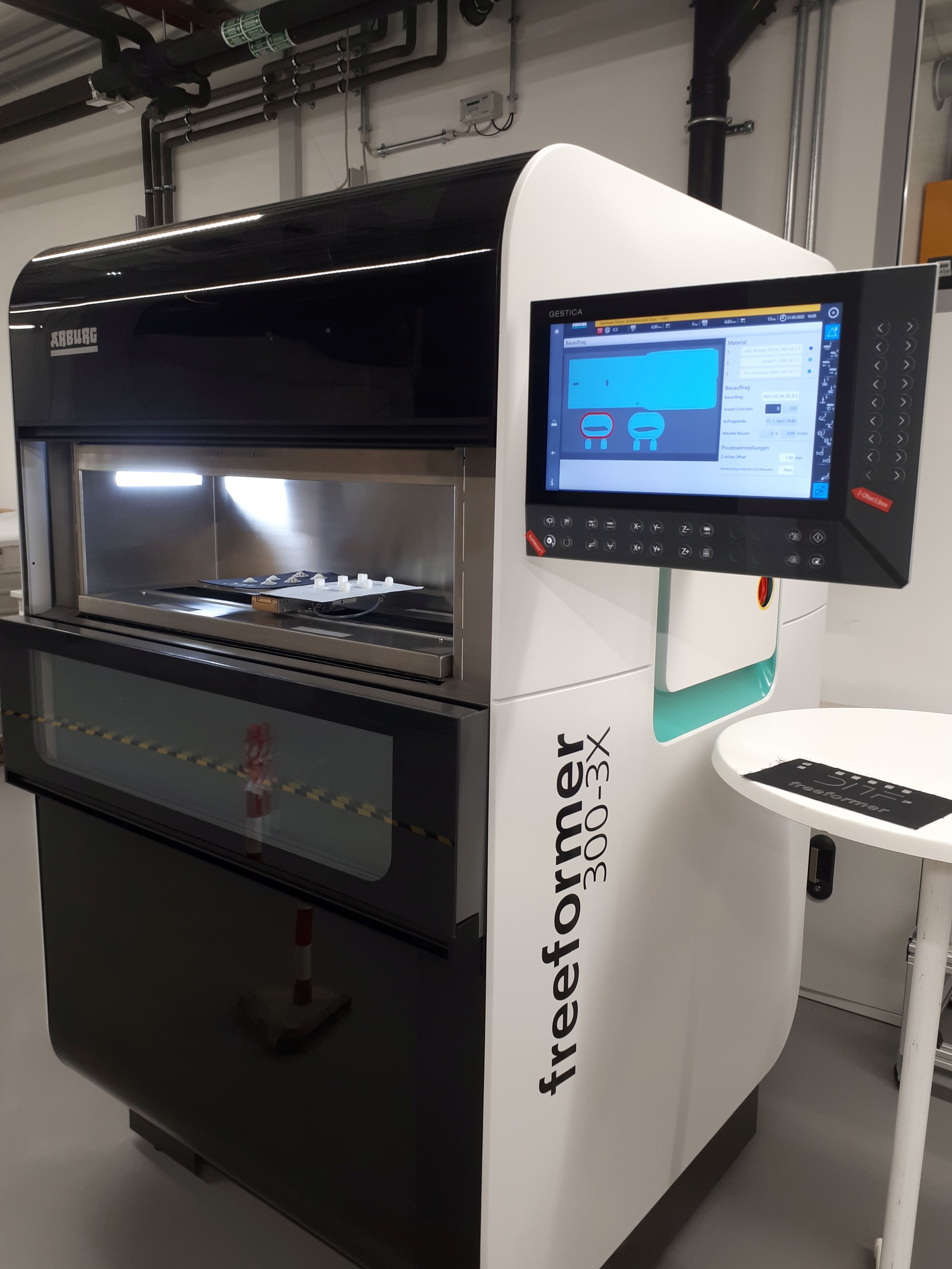 Die DITF arbeiten bei ihrer Forschung auch mit dem 3D-Drucker Arburg Freeformer 300-3X, der in einem Bauteil bis zu drei unterschiedlich harte, schmelzbare Polymere verarbeiten kann. Dadurch sind Hart-Weich-Übergänge möglich, die zum Beispiel bei Implantaten für den Körpergewebeersatz und für Kombinationen mit Textilien erforderlich sind. Der 3D-Drucker verarbeitet thermoplastische Kunststoffe direkt als Granulat ohne den Umweg über Druckfilamente oder Pulver, so dass auch sehr weiche oder empfindliche Materialien verarbeitet werden können.