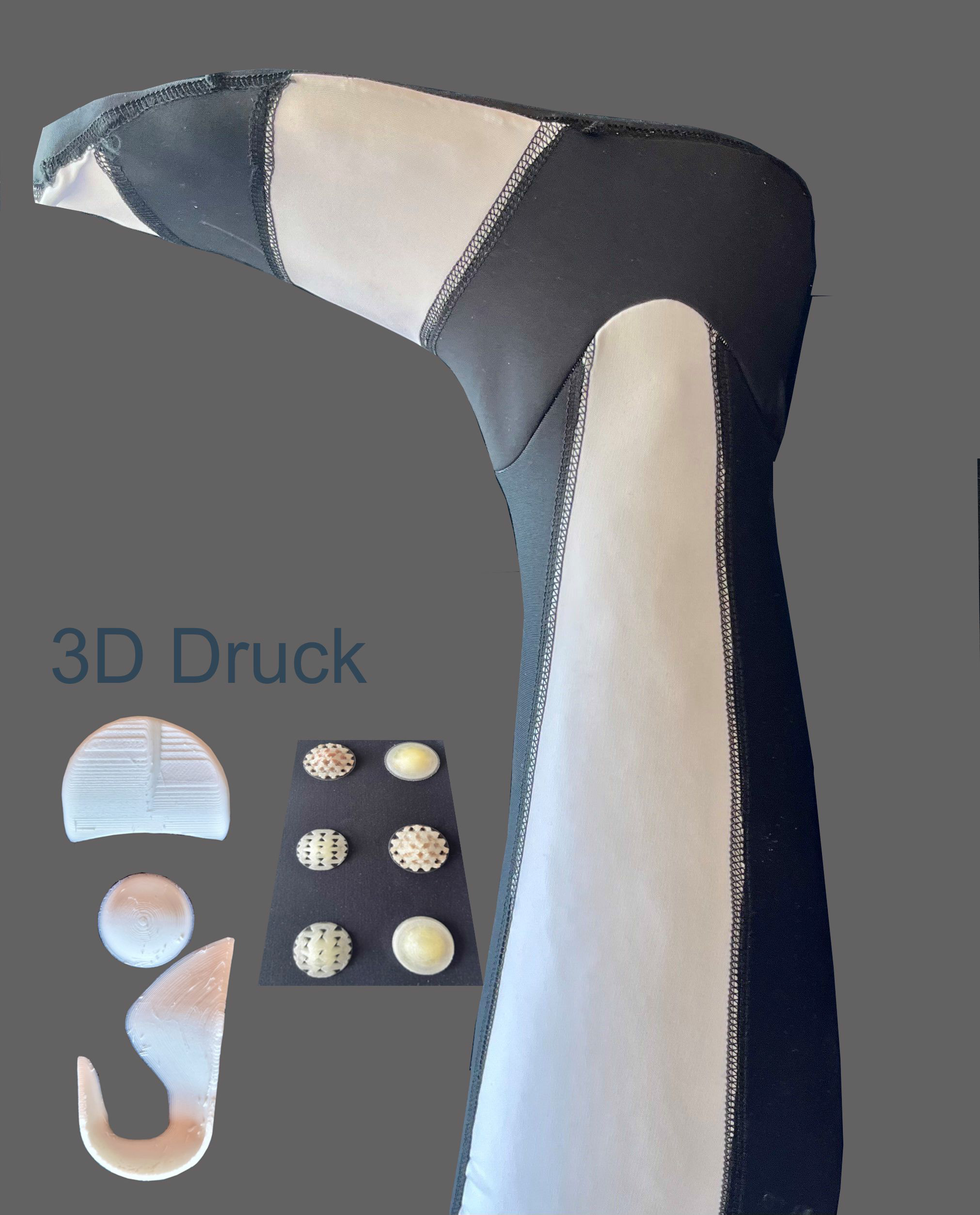 Eine Anwendung der additiven Fertigung auf Textilien durch den Auftrag von thermoplastischen Schichten ist die Herstellung von textilen Orthesen. Die DITF entwickeln zusammen mit dem Dynamic Competence Center Claudia Eisert (Mühltal) eine neuartige Fußorthese mit integriertem Fußbett für Patientinnen und Patienten mit Cerebralparese. Anders als bisherige Orthesen aus Kunststoff besteht diese dynamische Ankle-Foot-Orthese aus einem enganliegenden Strumpf, der den Fuß und das Sprunggelenk lückenlos umschließt. Durch die korrigierte Ausrichtung des Fußes und durch ein tiefensensorisches Feedback sind die Patientinnen und Patienten in der Lage, die Position und die Bewegung des eigenen Körpers besser wahrzunehmen.
