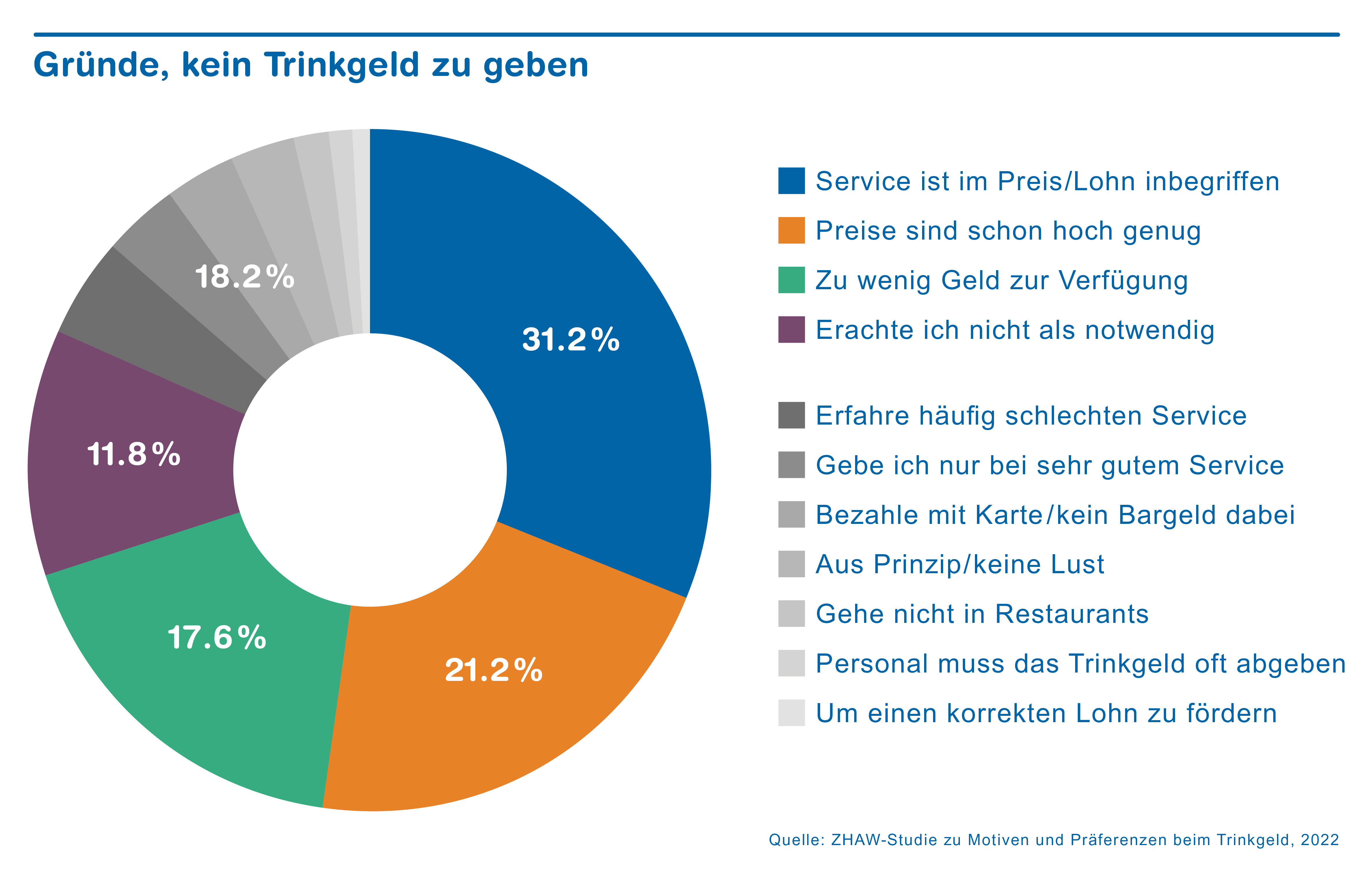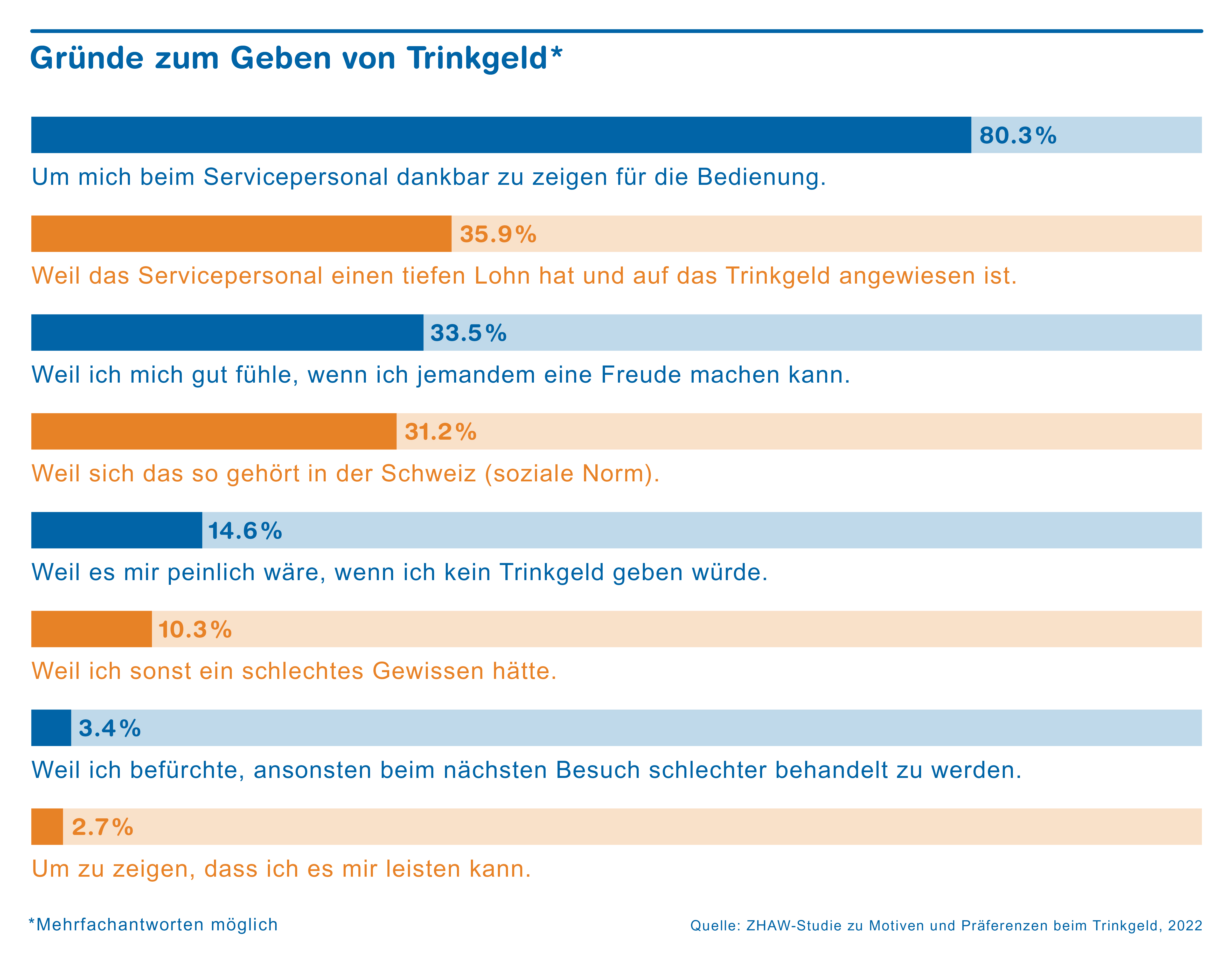 Bei der Motivation hinter dem zusätzlichen Betrag zeigt sich, dass das Zeigen von Dankbarkeit gegenüber dem Servicepersonal mit Abstand im Vordergrund steht (80.3 Prozent). Aufgrund der Möglichkeit auf Mehrfachantworten geben zusätzlich 35.9 Prozent der Befragten an, Trinkgeld zu geben, um die tiefen Löhne des Servicepersonals aufzubessern. Ebenso geben 33.5 Prozent an, sich gut zu fühlen, wenn sie jemandem eine Freude machen können. Und 31.2 Prozent der Schweizer Bevölkerung erachtet Trinkgeldgeben als soziale Norm, wobei dieser Wert in der Deutschschweiz deutlich höher ist als in der französisch- und italienischsprachigen Schweiz. So ist der Anteil derjenigen Gäste, die generell kein Trinkgeld geben, in der französisch- (17.7 Prozent) und italienischsprachigen (28.6 Prozent) auch höher als in der Deutschschweiz (12.7 Prozent). Als Grund für den Verzicht auf Trinkgeld wird am häufigsten genannt, dass die Serviceleistung bereits im Preis respektive im Lohn der Serviceperson inbegriffen ist, gefolgt von den ohnehin hohen Preisen in bedienten Restaurants und den fehlenden finanziellen Mitteln.