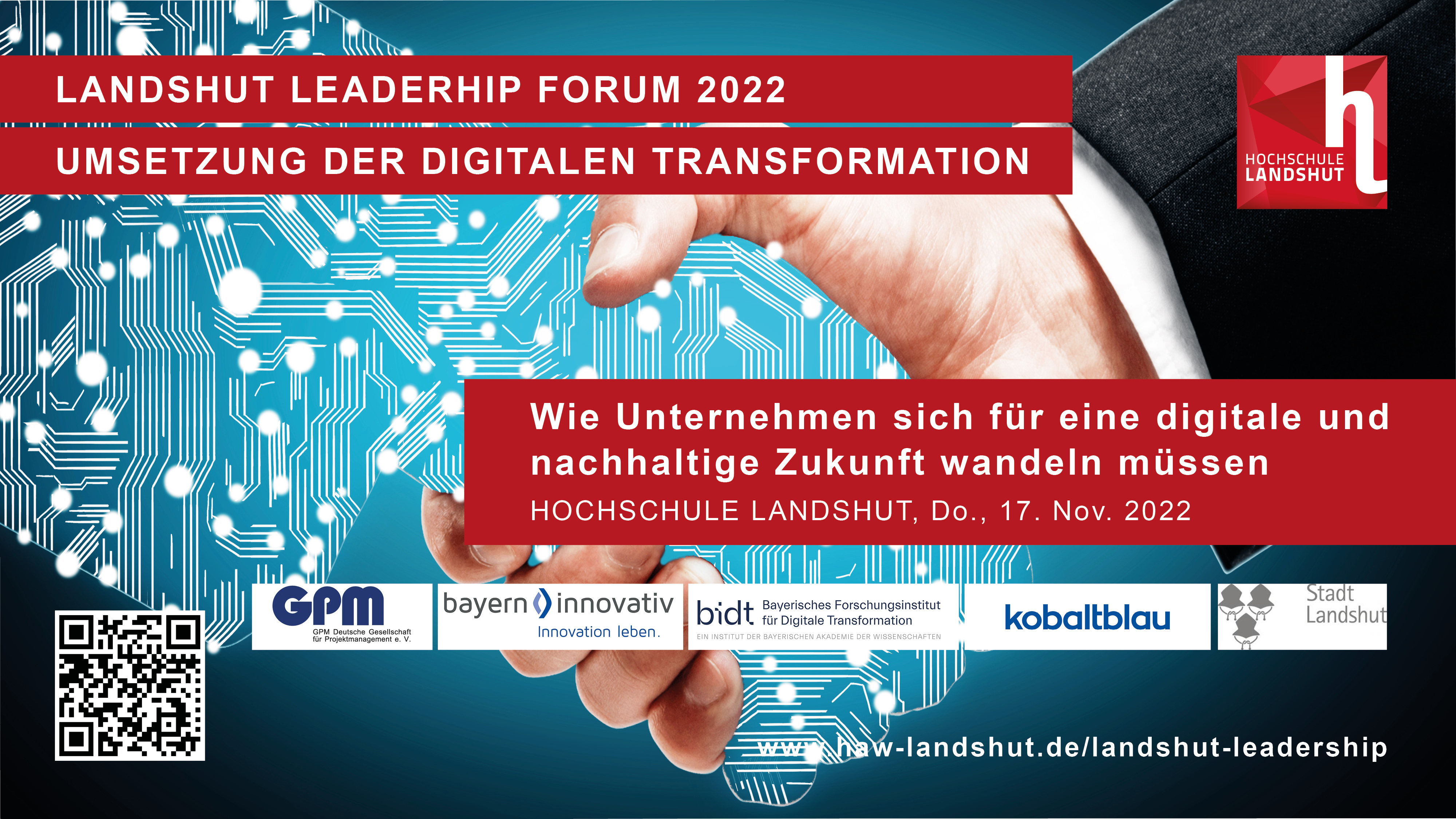 Beim Landshut Leadership Forum 2022 steht das „wie“ der Realisierung von digitalen Transformationsprozessen im Mittelpunkt. „Umsetzung der digitalen Transformation: Wie Unternehmen sich für eine digitale und nachhaltige Zukunft wandeln müssen“ lautet der Titel des Forums (17. November 2022) an der Hochschule Landshut. Hochrangige Referenten/-innen (u.a. von Bosch, Continental, Siemens, VW, Ernst & Young) werden diskutieren, wie die Herausforderungen und Chancen der digitalen Welt in Unternehmen angenommen und positiv genutzt werden können. Die Schirmherrschaft der Veranstaltung hat die Bayerische Staatsministerin für Digitales, Judith Gerlach, übernommen.