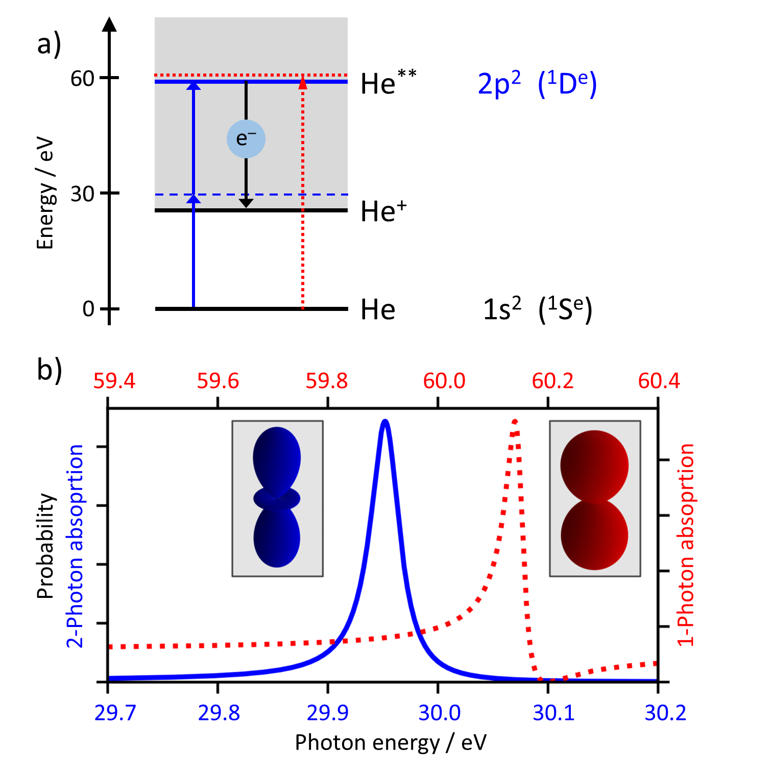 In this nonlinear process, both electrons simultaneously absorb two extreme-ultraviolet photons and form a doubly excited state in which, illustratively, both electrons are on a large orbit around the helium nucleus. The correlated pair dance of the electrons is unstable and their mutual repulsion causes one to leave the atom while the other falls back to the ground state of the helium ion – a process called autoionization (see Fig. 1). It occurs when the sum energy of the photons just corresponds to the discrete excitation energy, i.e. when the so-called resonance condition is fulfilled.