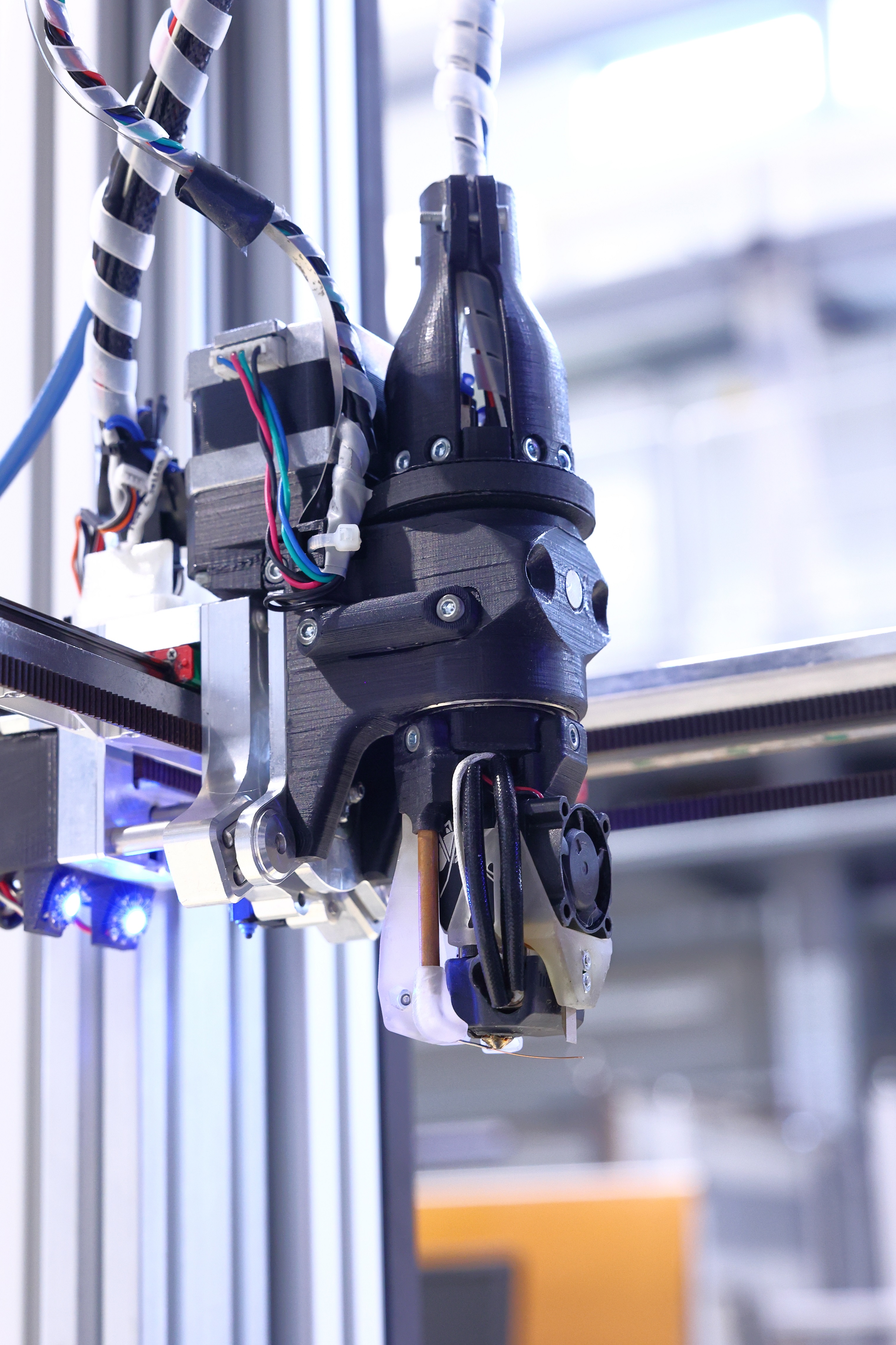 Multi Material Additive Manufacturing (MMAM) basiert auf einem Wechselsystem für das Werkzeug. Zu diesen Werkzeugköpfen gehören Strukturdruckköpfe, die technische Polymere mit bis zu 500°C verarbeiten können, Pick and Place Köpfe, die Bauteile, elektronische Elemente oder Kontakte automatisiert einsetzen können und Drahtintegrationsköpfe, die verschiedenste Draht- oder Fasermaterialien während des Druckprozesses in das Bauteil einbringen und in gewünschten Bereichen mit Polymer ummanteln. Bei Wire Encapsulating Additive Manufacturing (WEAM) wird der Draht gleich mit gedruckt. Eine Weltneuheit bei WEAM: der Druckkopf kann endlos rotieren und damit Druckbild und Drahtintegration verbessern. Im Bereich des industriellen, kunststoffbasierten 3D-Drucks präsentiert das Fraunhofer IWU eine Weiterentwicklung des preisgekrönten SEAM-Verfahrens, das die Herstellung hoher Stückzahlen auch großer Kunststoffbauteile aus preisgünstigem Standard-Granulat erlaubt.