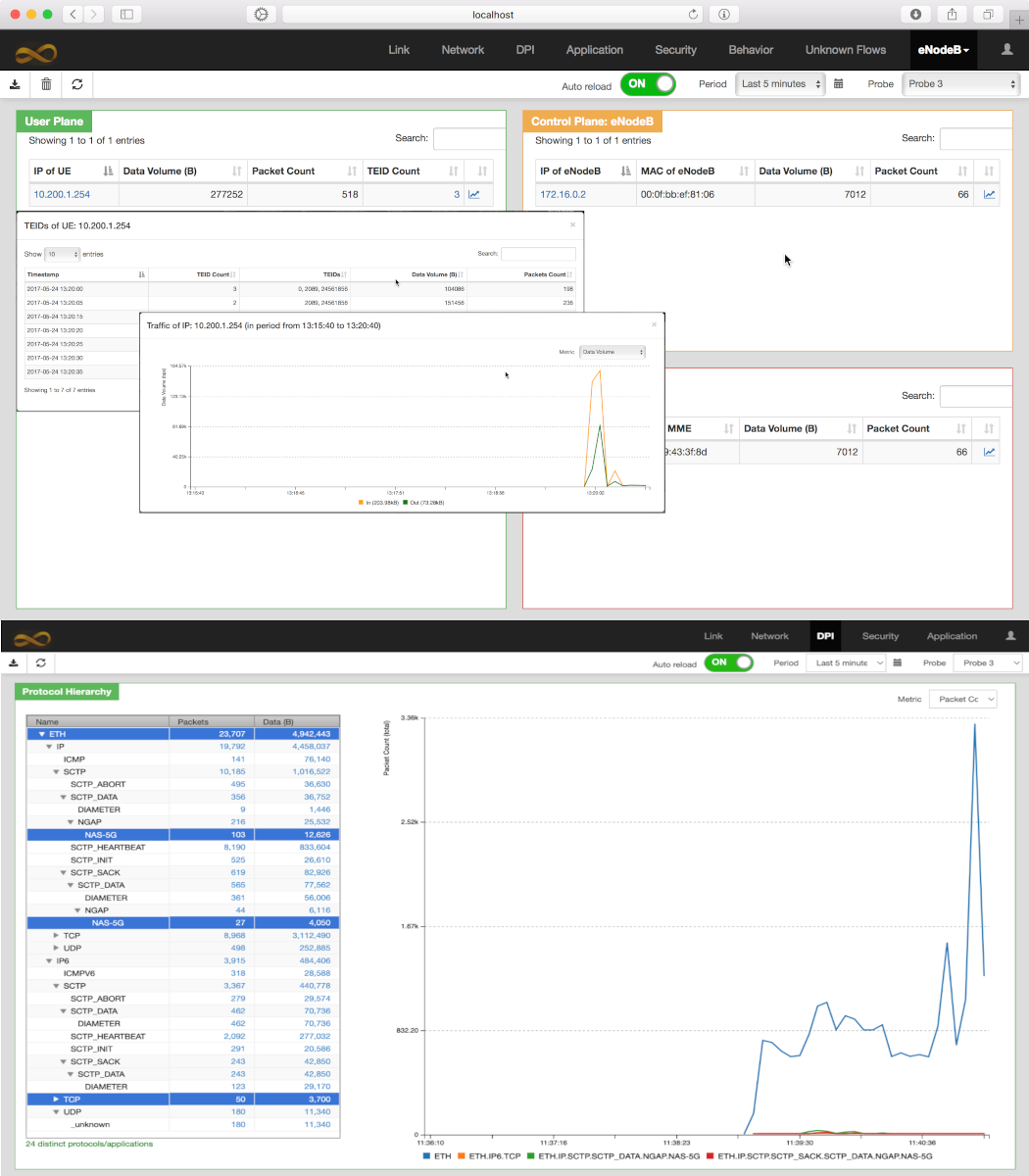 ● Integrated-security analysis and network statistic visualisation in real-time. MMT is a network traffic monitoring and security analysis framework. It is located between the RAN and the EPC/5G core to monitor network traffic of both the data and control planes.