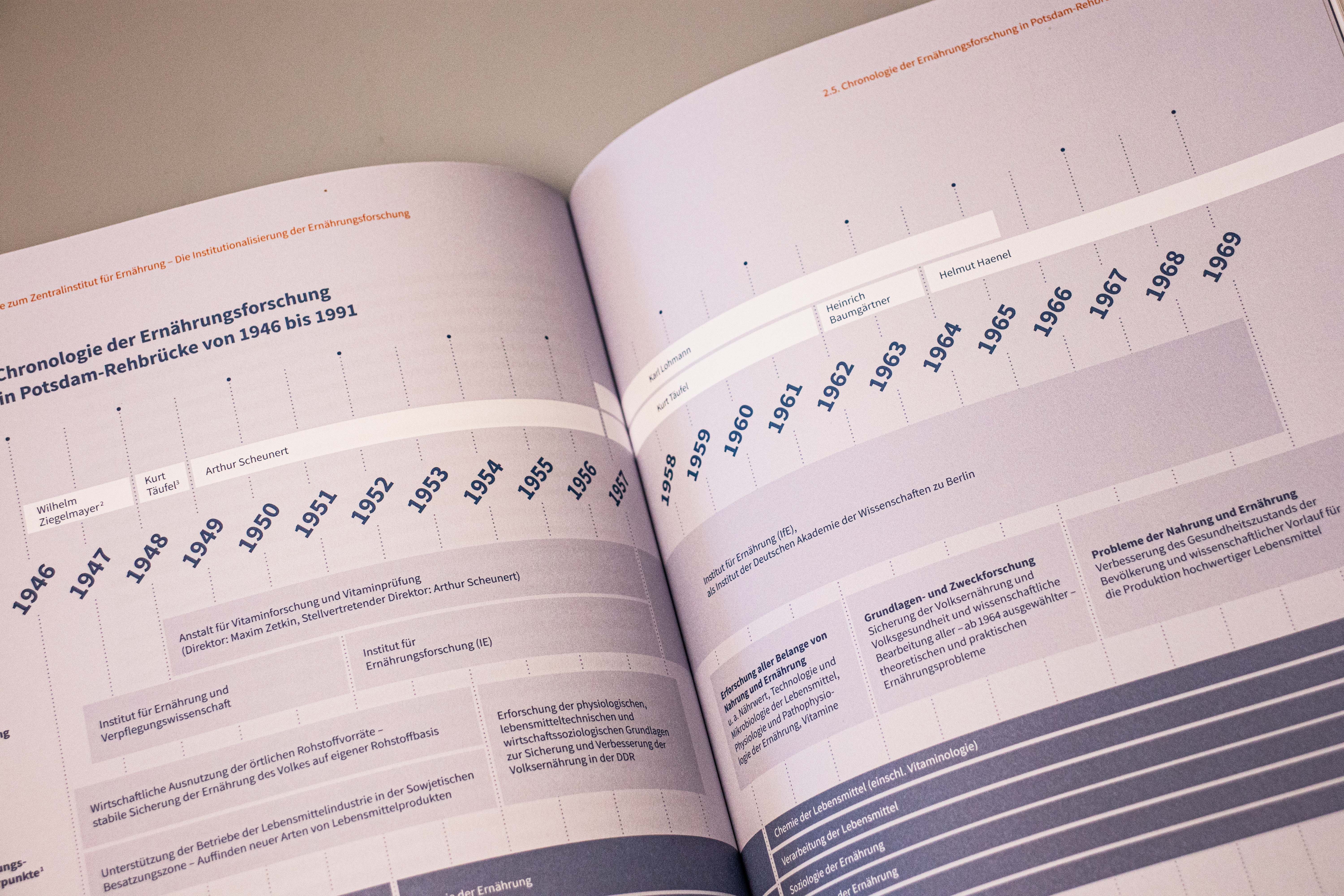 Das erste Kapitel beschreibt das Wirken von Arthur Scheunert und Wilhelm Ziegelmayer, die Anfänge der Vitaminforschung und deren Übergang zur Ernährungsforschung. „Bemerkenswert ist die Weitsichtigkeit, mit der die Institutsgründer schon damals agiert haben“, sagt Schäfer. Im zweiten Kapitel gehen Levit und Schäfer auf die Institutionalisierung der Ernährungsforschung in Deutschland ein. Dabei liegt der Fokus auf der Entstehung und Entwicklung des ZfE in der DDR, welche u. a. am Beispiel der Kindernahrung Manasan veranschaulicht wird. Einen zusammenfassenden Überblick der Ernährungsforschung am Standort Potsdam-Rehbrücke bietet die Chronologie am Kapitelende. Sie veranschaulicht die Institutsbezeichnungen samt Direktoren sowie die Forschungsschwerpunkte und -bereiche von 1946 bis Ende 1991. Es folgt die Wendezeit, die mit dem Übergang vom ZfE zum DIfE verbunden ist und im dritten Kapitel dargestellt wird. Auch dieses Kapitel endet mit einer Chronologie, in der die wichtigsten politischen und institutsbezogenen Ereignisse von 1989 bis 1992 präsentiert werden.