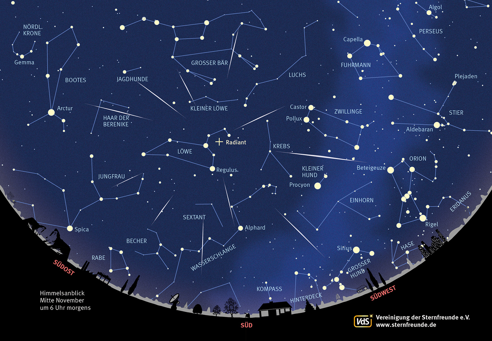 Sternkarte für die Morgenstunden Mitte November mit Blickrichtung Süden. Im Sternbild Löwe ist der Ursprungspunkt der Leoniden-Sternschnuppen mit einem Kreuz markiert