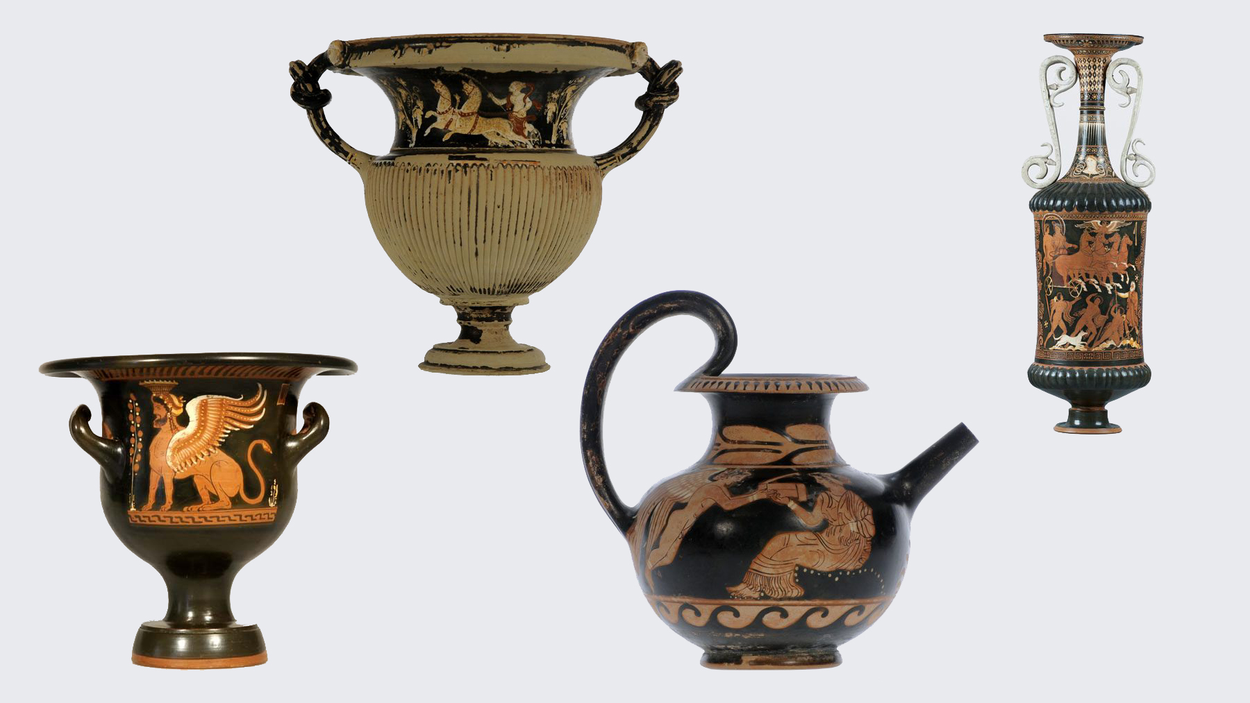 Lutrophore: Der Hals zeigt einen weiblichen Kopf in Dreiviertelansicht nach links im Blütenkelch. Der obere Bauch zeigt die Entführung des Kephalos durch die Göttin Eos; der untere Bauch zeigt Jäger, die die Entführung beobachten und einen weißbärtigen Pädagogen. Detailinformationen unter http://www.museen-sh.de/Objekt/DE-MUS-075618/lido/B+787