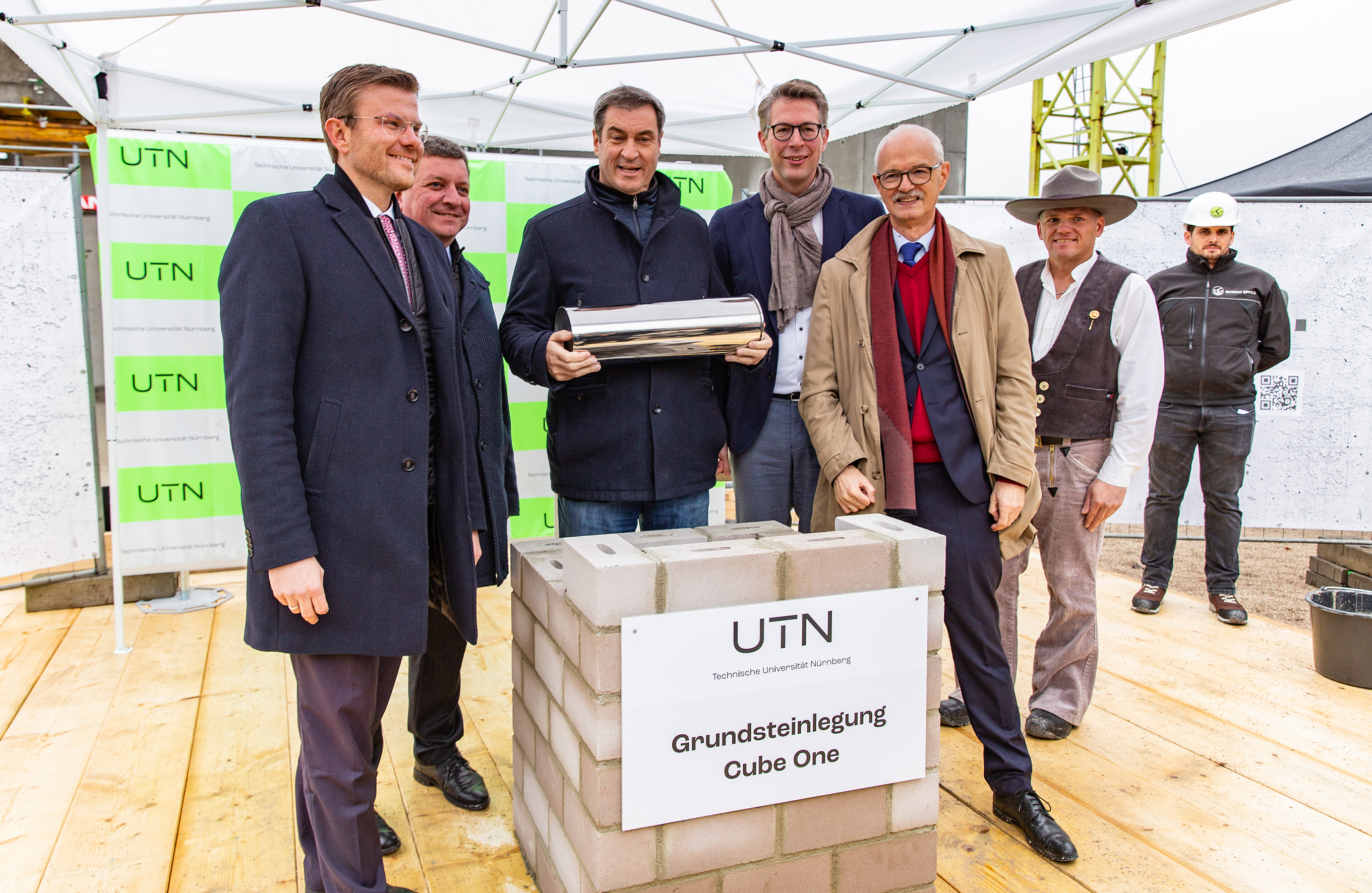 Prof. Dr. Dr. h.c. mult. Hans Jürgen Prömel, Gründungspräsident an der TU Nürnberg, fügte der Kapsel eine Tasse im neuen Corporate Design der Universität bei und betonte: „Heute haben wir nicht nur den Grundstein für unser erstes Gebäude gelegt. Wir schaffen mit Cube One auch das Fundament für einen innovativen Campus, an dem wir Universität neu denken werden – in Forschung, Lehre, Struktur und Verwaltung. Mit einem interdisziplinären Ansatz, einem zukunftsweisendem Fächerspektrum sowie neuen Lehr- und Lernmethoden werden wir hier eine Universität mit Modellcharakter errichten.“