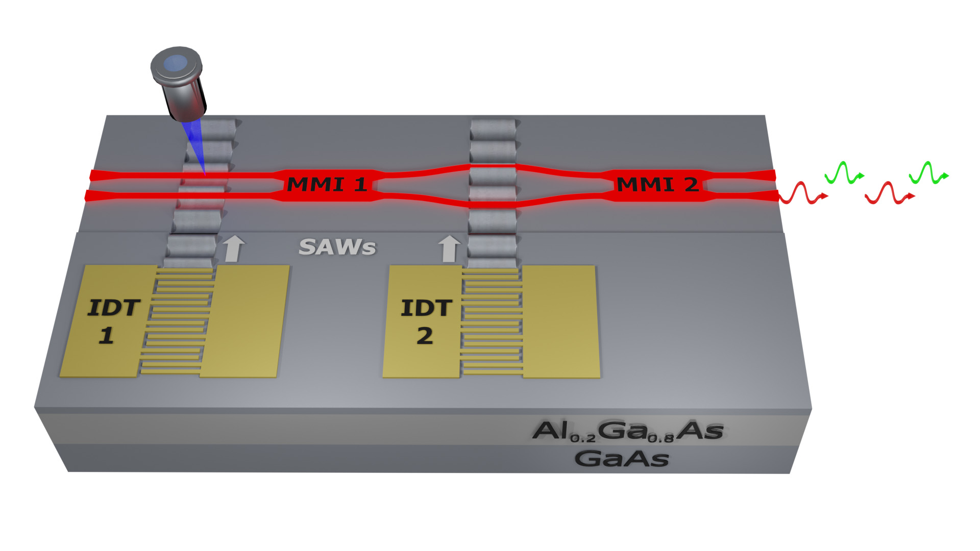 A focused laserbeam (left, blue) generates single photos by a single quantum dot inside the photonic waveguides (red), which are fabricated on top of crystalline gallium arsenide- (GaAs-) aluminium gallium arsenide (Al0.2Ga0.8As).Two interdigitating electrodes (interdigital transducers, IDT) generate nanoscale soundwaves (surface acoustic waves, SAWs), which dynamically strain the waveguides. The nanoscale soundwave generated by the left IDT switches the color of the emitted single photons. The two waveguides are coupled by two so-called multimode interference beamsplitters (MMIs). The soundwave generated by the right IDT sorts the single photons according to their colour (red and green) between the two outputs on the right.