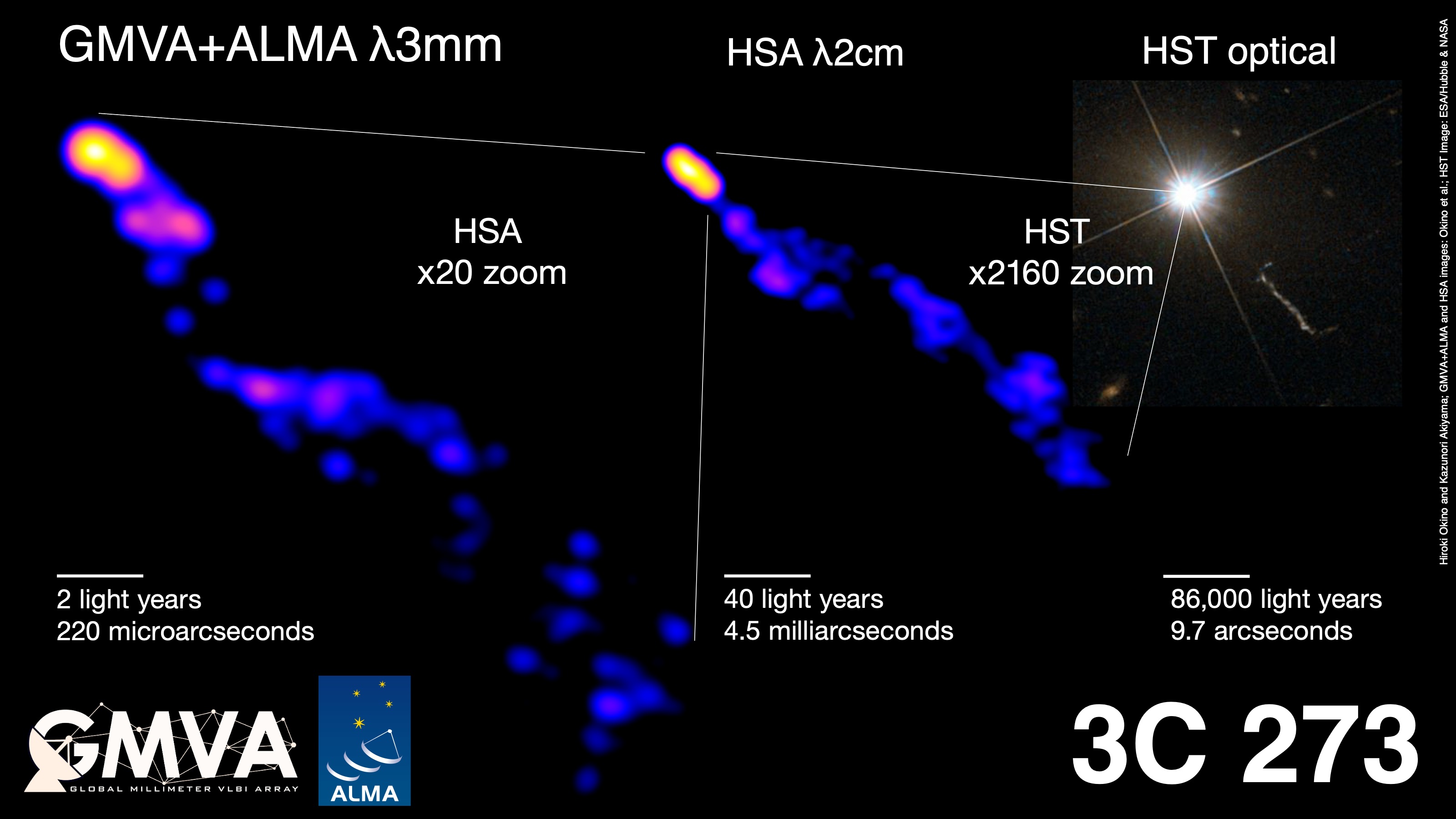 This new study, published today in The Astrophysical Journal, includes observations of the 3C 273 jet at the highest angular resolution to date. The ground-breaking work was made possible by using a closely coordinated set of radio antennas around the globe, a combination of the Global Millimeter VLBI Array (GMVA) and the Atacama Large Millimeter/submillimeter Array (ALMA) in Chile. In addition, coordinated observations were also made with the High Sensitivity Array (HSA) to extend the study of 3C 273 to larger scales, in order to also measure the global shape of the jet. The data in this research were collected in 2017, around the same time that the Event Horizon Telescope (EHT) observations revealed the first images of a black hole in M87, which is a radio galaxy about 20 times closer than 3C273.