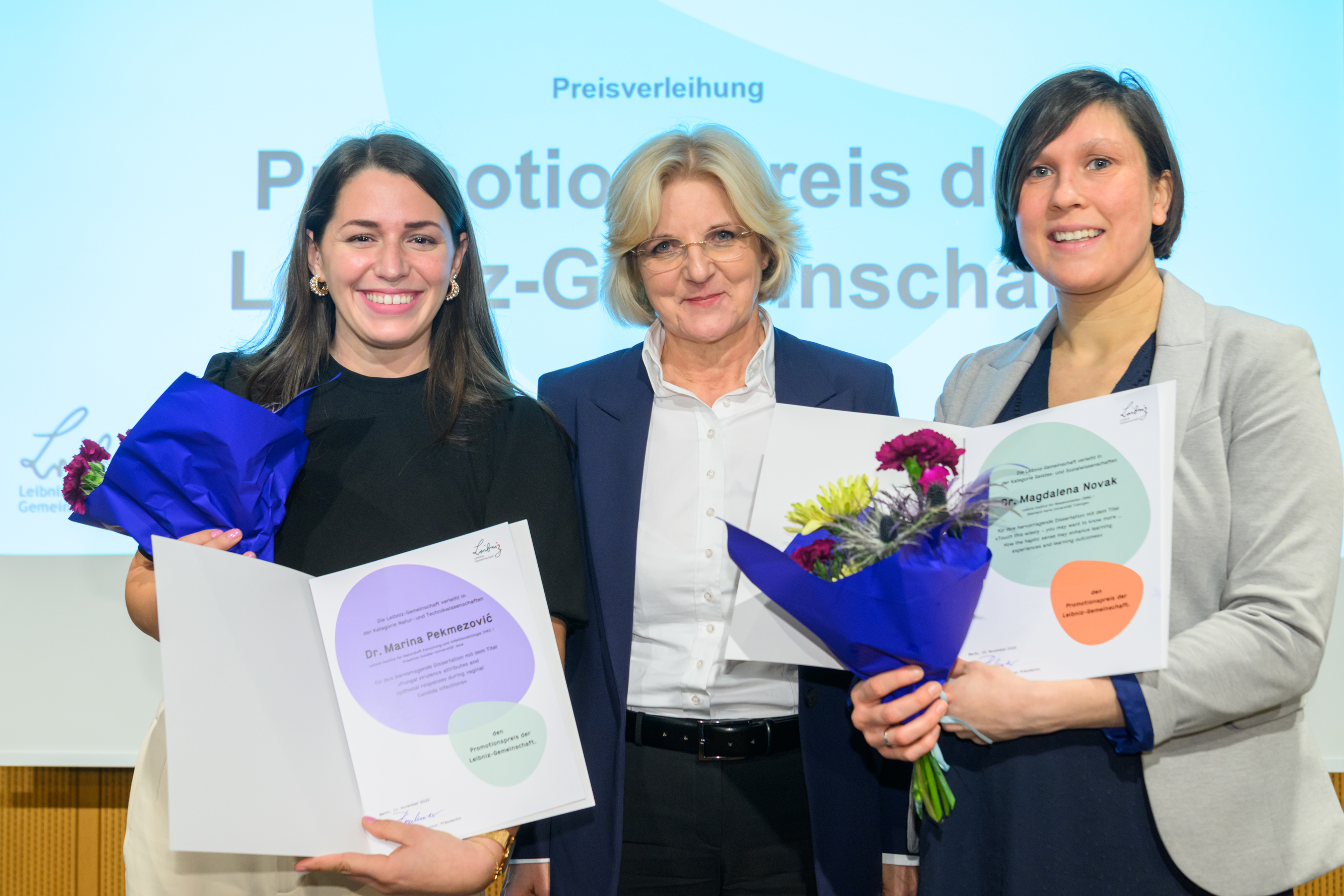 Magdalena Novak beschäftigte sich in ihrer Doktorarbeit mit der Rolle haptischer, also über das Anfassen gemachter Erfahrungen mit authentischen Objekten für das Lernen in Museen. Marina Pekmezović untersuchte molekulare Mechanismen der Interaktion zwischen Epithelzellen des weiblichen Fortpflanzungstrakts und dem Hefepilz Candida. Die beiden mit jeweils 5.000 Euro prämierten Arbeiten wurden als beste aus mehr als 800 Promotionsvorhaben ausgewählt, die im Jahr 2021 an Leibniz-Instituten abgeschlossen wurden.