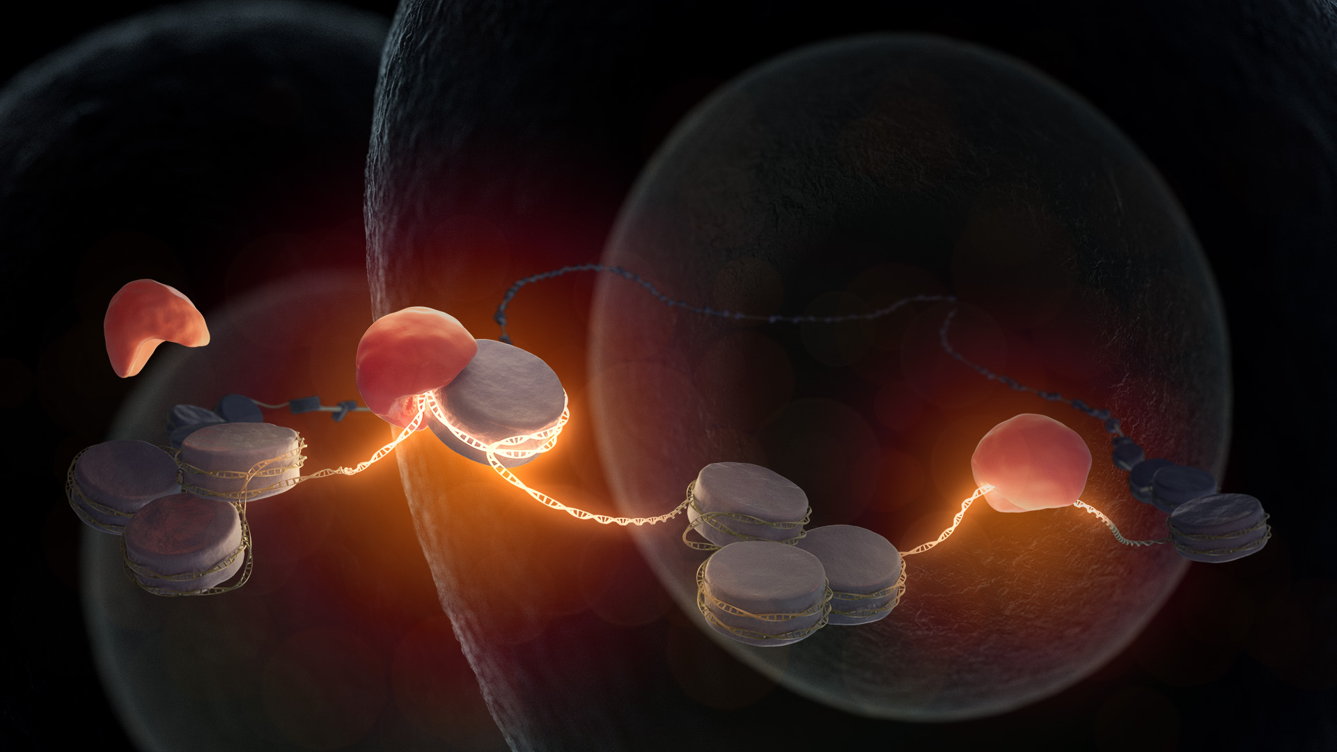 Siwat Ruangroengkulrith, Molekularbiologe und Bioinformatiker, erklärt: „Die genetische Information ist im Zellkern nicht einfach frei zugänglich. Sie liegt in Form eines langen DNA-Fadens vor, der wie eine Perlenkette um kleine Verpackungsproteine, die so genannten Histone, gewickelt ist. DNA und Histone sind so ineinander verdreht, dass der DNA-Faden bis zu 40.000-fach verkürzt ist. Das ist der Grund, warum wir die DNA unter dem Mikroskop als Chromosomen sehen können.“
