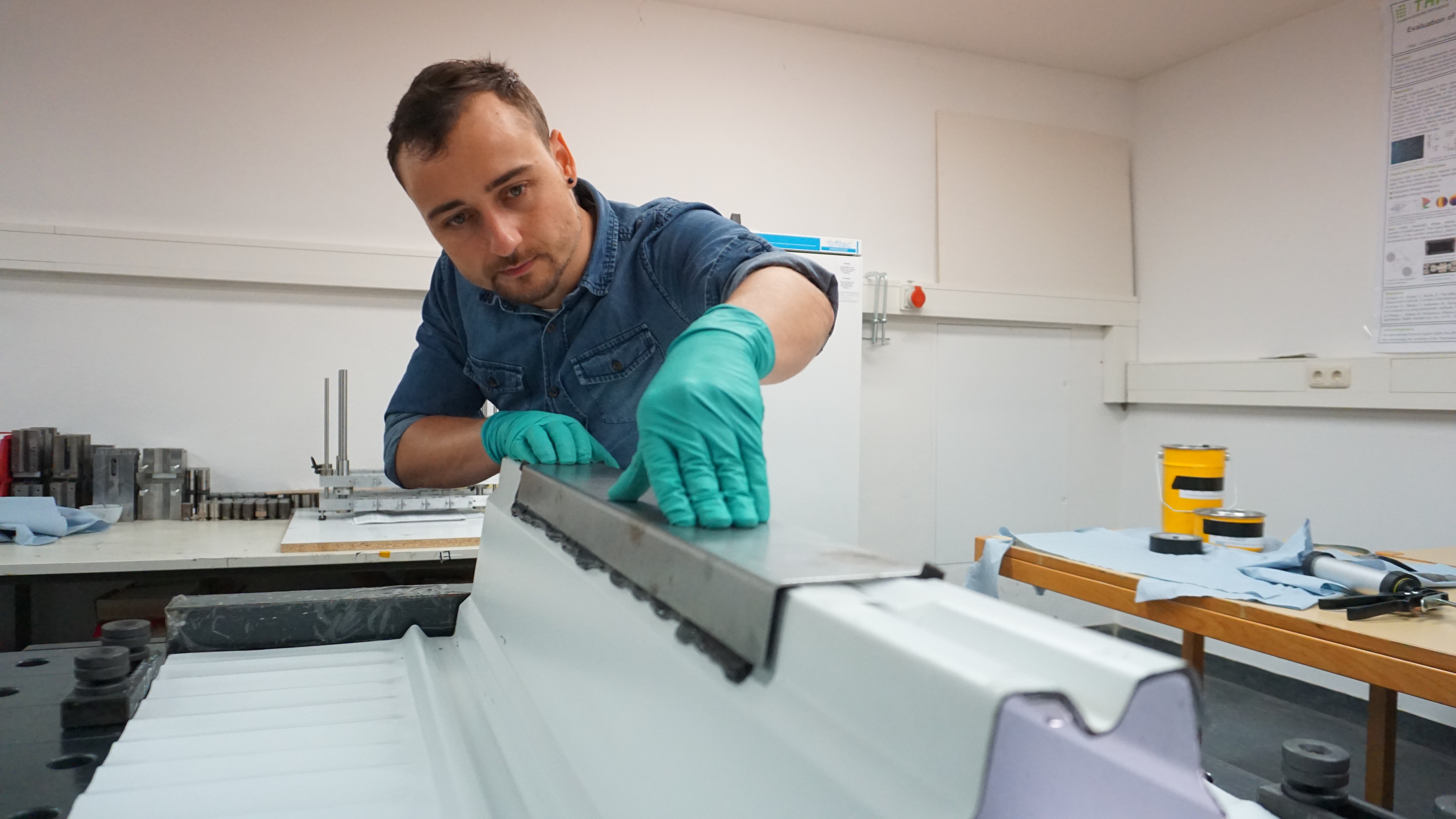 Auf der Deckenunterseite werden auf die geschädigten Trapezbleche dauerhafte Verstärkungen aus Stahl mit chloriddichten Klebstoff angebracht. Prof. Dr. Christian Schuler, ebenfalls Forscher an der Fakultät für Bauingenieurwesen der HM, ist im Projekt verantwortlich für das Thema Sanierung mit Klebstoffen: „Wir installieren keine neuen Träger oder Abstützungen, sondern wollen mit einer Art Pflaster die Kraft homogen um die Schadstelle herumleiten“. Erste Langzeitversuche belegen die Wirksamkeit beider Methoden: dass das KKS-System die weitere Korrosion aufhält und dass die klebtechnische Verstärkung weiterhin die Tragfähigkeit der Konstruktion gewährleistet.