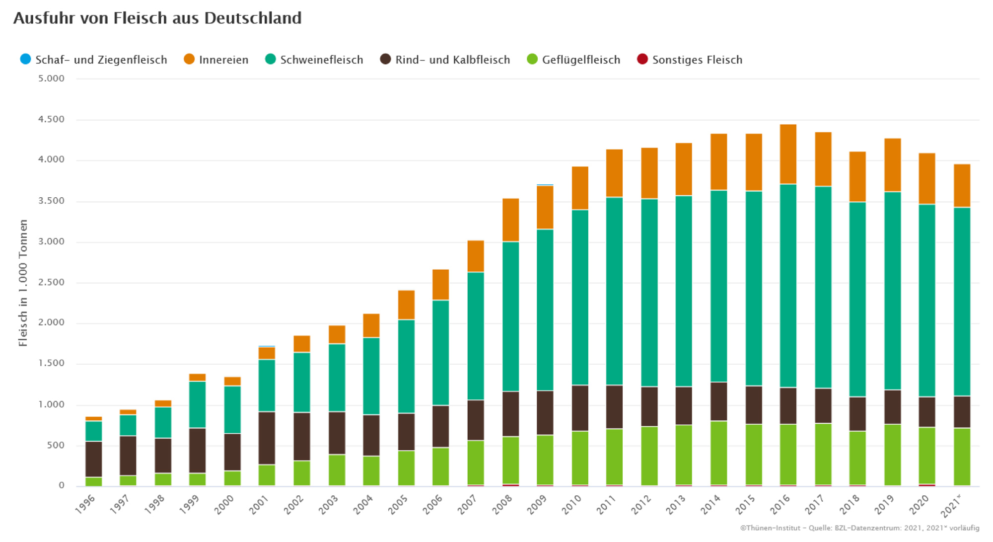 Die Rindfleischproduktion stagniert seit Jahren. Die gesamte Fleischproduktion in Deutschland lag 2021 bei knapp 8,23 Millionen Tonnen (inkl. Innereien sowie Schlachtnebenerzeugnissen), was einem Rückgang von knapp 3 % gegenüber dem Vorjahr entspricht. Hiervon entfiel mit 4,97 Millionen Tonnen der größte Teil noch immer auf Schweineschlachtungen, gefolgt von Geflügel- und Rinderschlachtungen. Nach wie vor ist Deutschland beim Fleisch ein Nettoexporteur, allerdings in den letzten drei Jahren mit leicht rückläufiger Tendenz. Hauptausfuhrgut war trotz der schwierigen Situation weiterhin mit großem Abstand Schweinefleisch, das aufgrund des weitgehenden Rückgangs der Exporte in Drittländer fast ausschließlich innerhalb der EU gehandelt wurde.