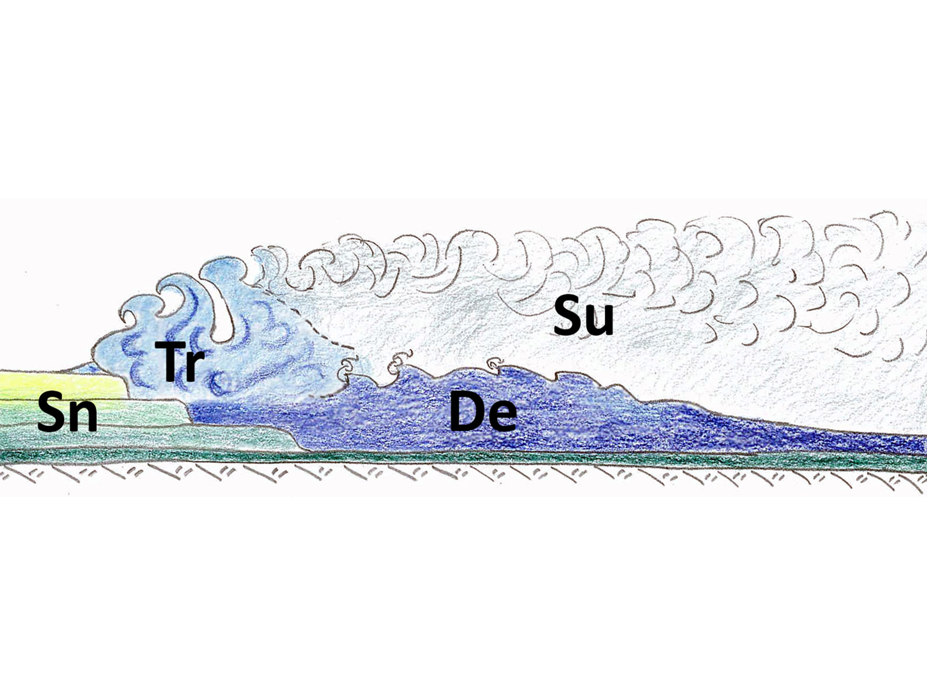 Zur gleichen Erkenntnis gelangten auch Vulkanforschende aus Neuseeland: Auch pyroklastische Ströme – heisse Ströme aus Asche und Gas, die nach Vulkanausbrüchen auftreten – weisen einen pulsierenden Charakter auf. Im Unterschied zu Staublawinen sind diese Ströme jedoch sehr heiss, was deren Untersuchung erschwert. Doch zeigen gross angelegte Experimente sowie direkte Messungen im Innern der pyroklastischen Ströme des verheerenden Ausbruchs des Whakaari (White Island, Neuseeland) am 9. Dezember 2019: Es ist der turbulente und pulsierende Übergangsbereich, der für die Zerstörungskraft der pyroklastischen Ströme verantwortlich ist und diese noch verstärkt.