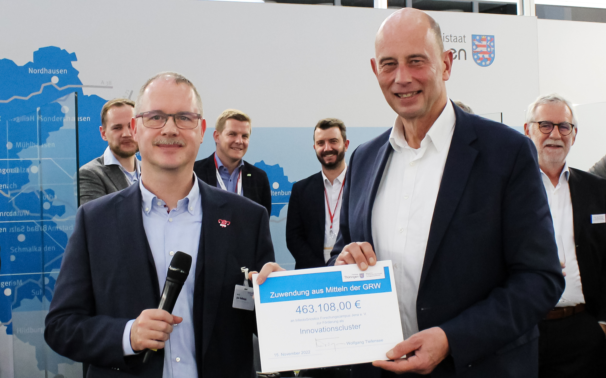 Der InfectoGnostics Forschungscampus Jena ist nun auch offiziell ein Innovationscluster Thüringens: Einen symbolischen Scheck in Höhe von 463.108 Euro überreichte Wolfgang Tiefensee, der Thüringer Minister für Wirtschaft, Wissenschaft und Digitale Gesellschaft während der weltgrößten Messe der Medizinbranche, MEDICA, in Düsseldorf.