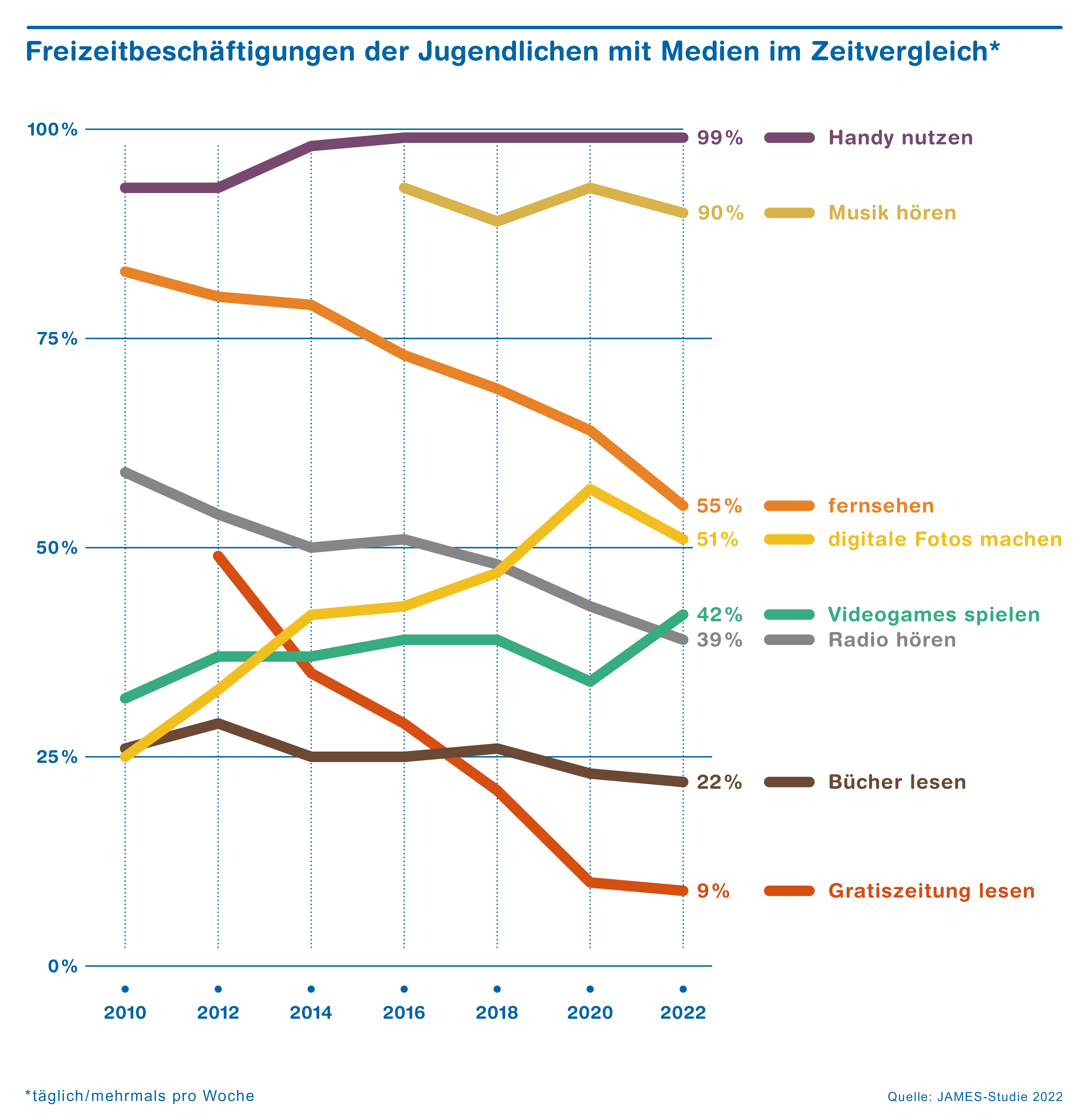 Bei den breit genutzten sozialen Netzwerken setzen Mädchen die Trends. Sie steigen früher auf neue soziale Netzwerke ein als Jungen, wie die JAMES-Studie 2022 der ZHAW und Swisscom zeigt. Jungs gamen dafür häufiger, besonders beliebt sind Gratis-Games. Jugendliche pflegen zudem weniger, jedoch qualitativ hochwertigere Freundschaften als vor zehn Jahren. Problematisch ist, dass sie beim Datenschutz nachlässiger werden und sexuelle Belästigungen weiter zugenommen haben.