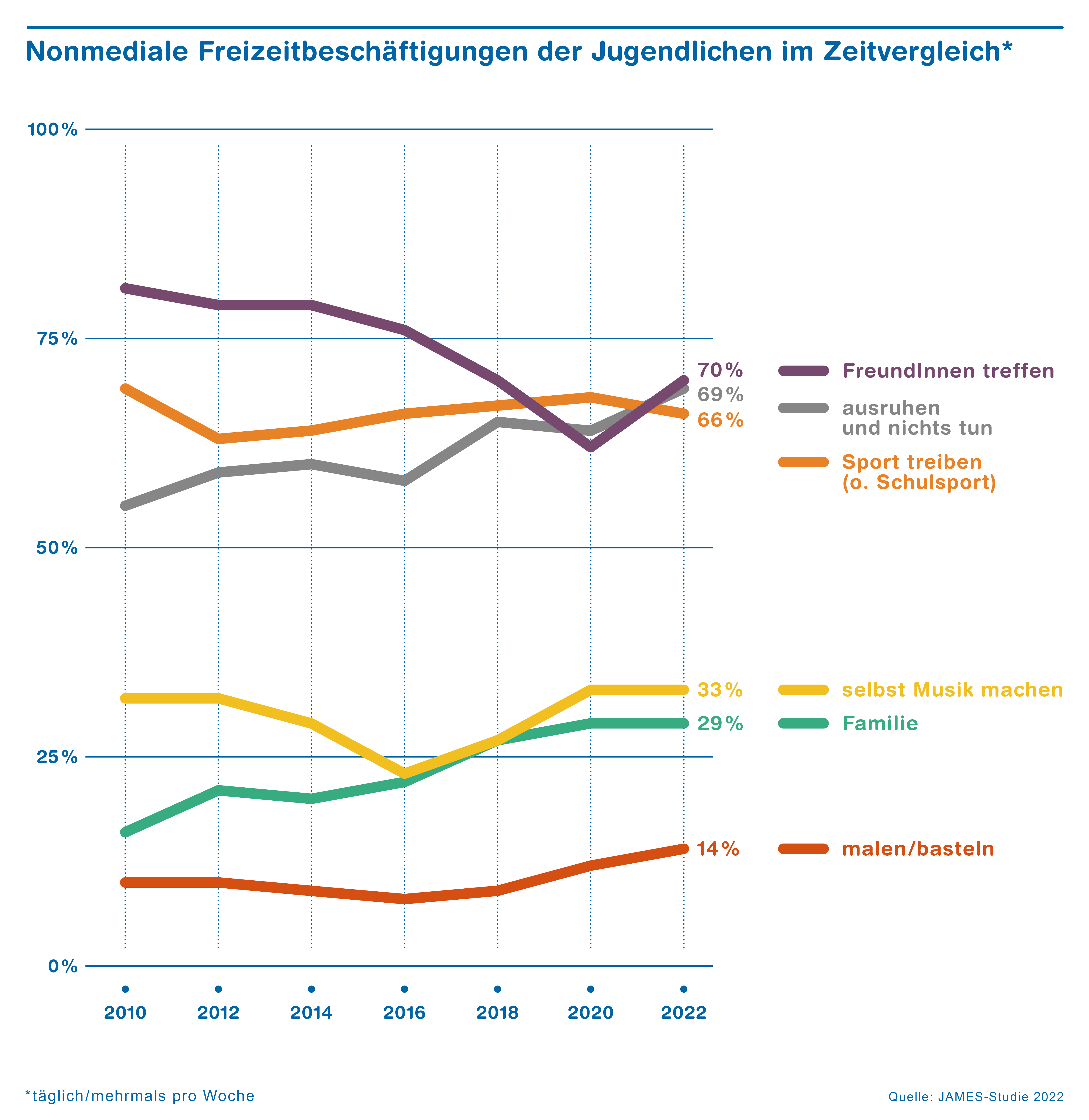Ein grosser Teil der Jugendlichen in der Schweiz trifft sich in der Freizeit regelmässig mit Freund:innen (70 Prozent). Im Vergleich zu den Vorjahren zeigt sich jedoch, dass die Anzahl der Freundschaften abgenommen hat. Trafen sich die befragten Jugendlichen 2012 mit sieben Freund:innen regelmässig, sind es 2022 noch fünf. Für Gregor Waller setzt sich damit der Trend des ‚Social Cocooning‘ weiter fort. «Die Jugendlichen treffen weniger Freundinnen und Freunde als noch vor ein paar Jahren. Wenn die Heranwachsenden im Sinne von ‚Beziehungsminimalismus‘ vorgehen, also Qualität vor Quantität stellen, sind die Freundschaften aber insgesamt hochwertiger».