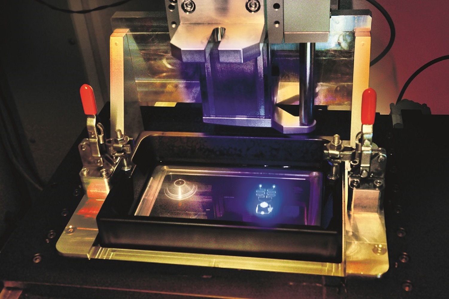Der 3D-Drucker HoPro-3D besitzt zwei wählbare Belichtungssysteme, für entweder hohe Aufbauraten (scrolling DLP) oder hohe Präzision (MPP). Das DLP-Modul mit einer Wellenlänge von 365 nm belichtet die Basisstrukturen eines Mikrobauteils mit einer Pixelauflösung von 10 µm. Ergänzend können mit einem Femtosekundenlaser und dem MPP-Modul Konturlinien mit einer Auflösung von etwa 2 µm geschrieben werden.