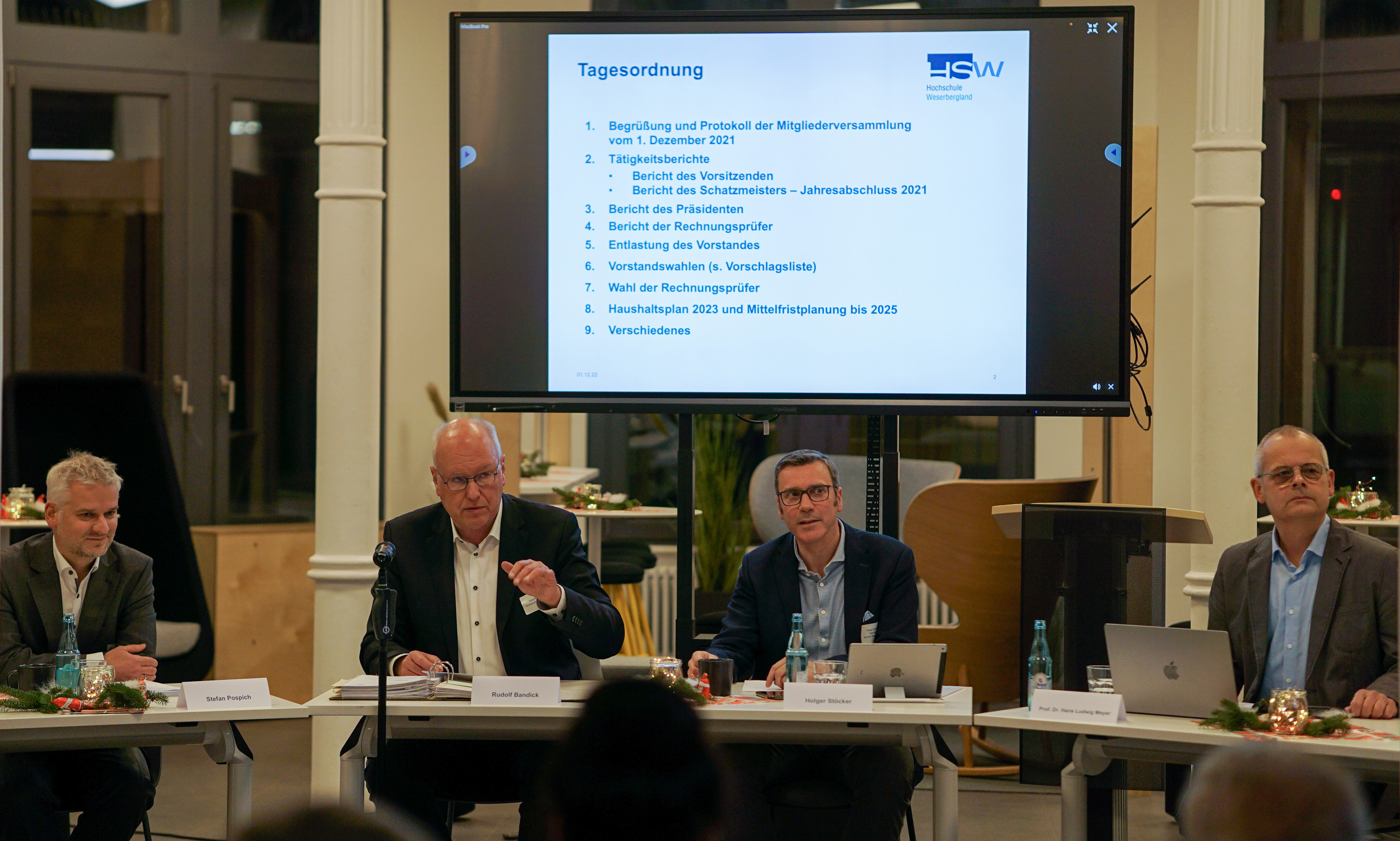 (Hameln, im Dezember 2022). Am vergangenen Donnerstag kamen der Vorstand, Unternehmensvertreter und das Präsidium der Hochschule Weserbergland (HSW) zur Mitgliederversammlung des Trägervereins der Hochschule Weserbergland e. V. im Kaisersaal des Hamelner Bahnhofs zusammen. Im Rahmen der alljährlichen Veranstaltung wurden der langjährige Vorsitzende Rudolf Bandick sowie der Beisitzende Torsten Schulte verabschiedet. Die Verabschiedung selbst stand dabei passend zum am selben Tag stattfindenden WM-Spiel Deutschland gegen Costa Rica unter dem Motto „Fußball“.