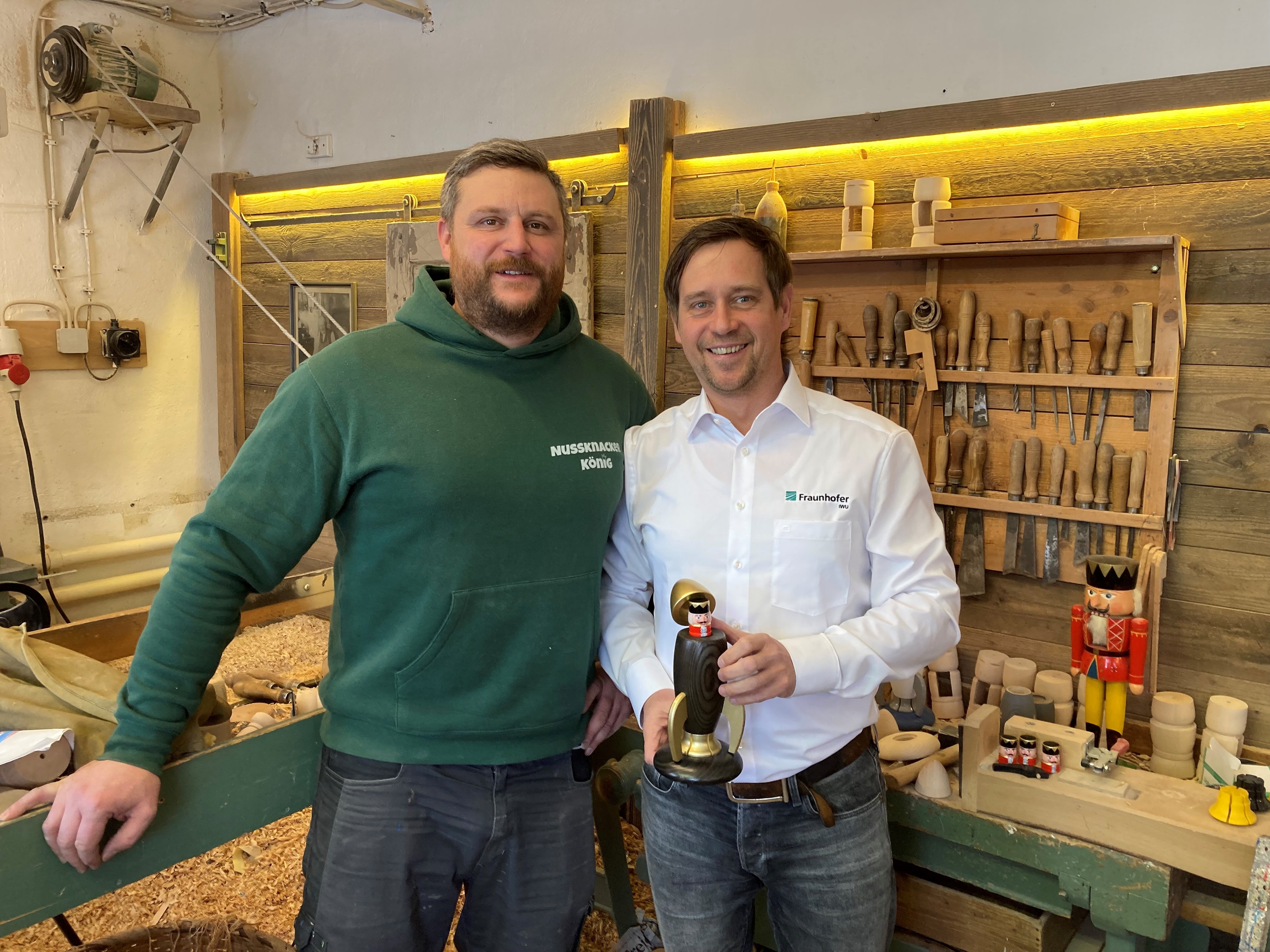 Die Initialzündung für die Idee, Anwendungsmöglichkeiten für intelligente Werkstoffe im traditionsreichen erzgebirgischen Kunsthandwerk zu erschließen, entstand aus Kontakten des Seiffener Kreativzentrums »Denkstatt Erzgebirge« um Wolfgang Braun mit dem Team um Holger Kunze, Leiter des Geschäftsfelds Symbiotic Mechatronics am Fraunhofer IWU. Bereits im Dezember 2021 grüßte Nussknacker Wilhelm von der ISS und inspirierte so Fraunhofer-Forschende und seine fünf »Untertanen« (Markus Füchtner und vier weitere Mitstreiter aus Seiffen), über (vor-)weihnachtliche Produkte nachzudenken. In den Laboren des Fraunhofer IWU begannen Andreas Erben, Kenny Pagel und Holger Kunze sogleich, erzgebirgische Räuchermänner auf Herz und Nieren zu prüfen. Das Ergebnis nach rund einem Jahr Vorarbeit: Am 10. Dezember 2022 hob nun die Räucher-rakete zu ihrem Erstflug (Markteinführung) ab. Auch wenn sich in den offiziellen Patentunterlagen Wilhelm nicht als Erfinder dieser Anwendung einer Formgedächtnislegierung wiederfindet, so stammt das Material doch aus der Weltraumforschung und fand sich zuerst in Anwendungen der Luftfahrt und Weltraumtechnik wieder.