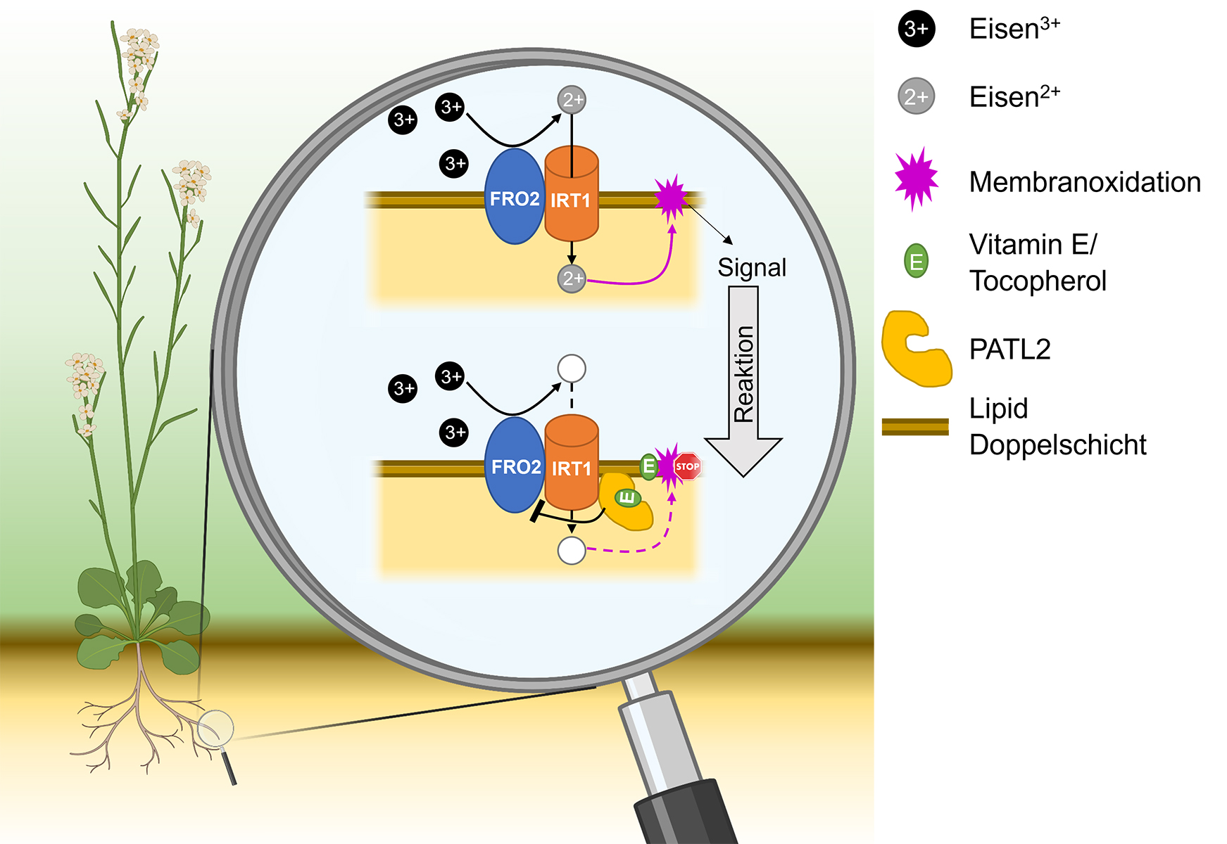 Die Aktivität von IRT1 wird von Wurzelzellen kontrolliert, wodurch Pflanzen die durch Metallionen hervorgerufene Toxizität und oxidativen Stress begrenzen können. Die HHU-Forschenden konnten zeigen, dass IRT1 ein bestimmtes Transportmolekül bindet, das sogenannte SEC14-Domänen-Lipidtransferprotein PATELLIN2. Dieses verändert wiederum seine Proteinumgebung in Abhängigkeit von der Eisenversorgung.