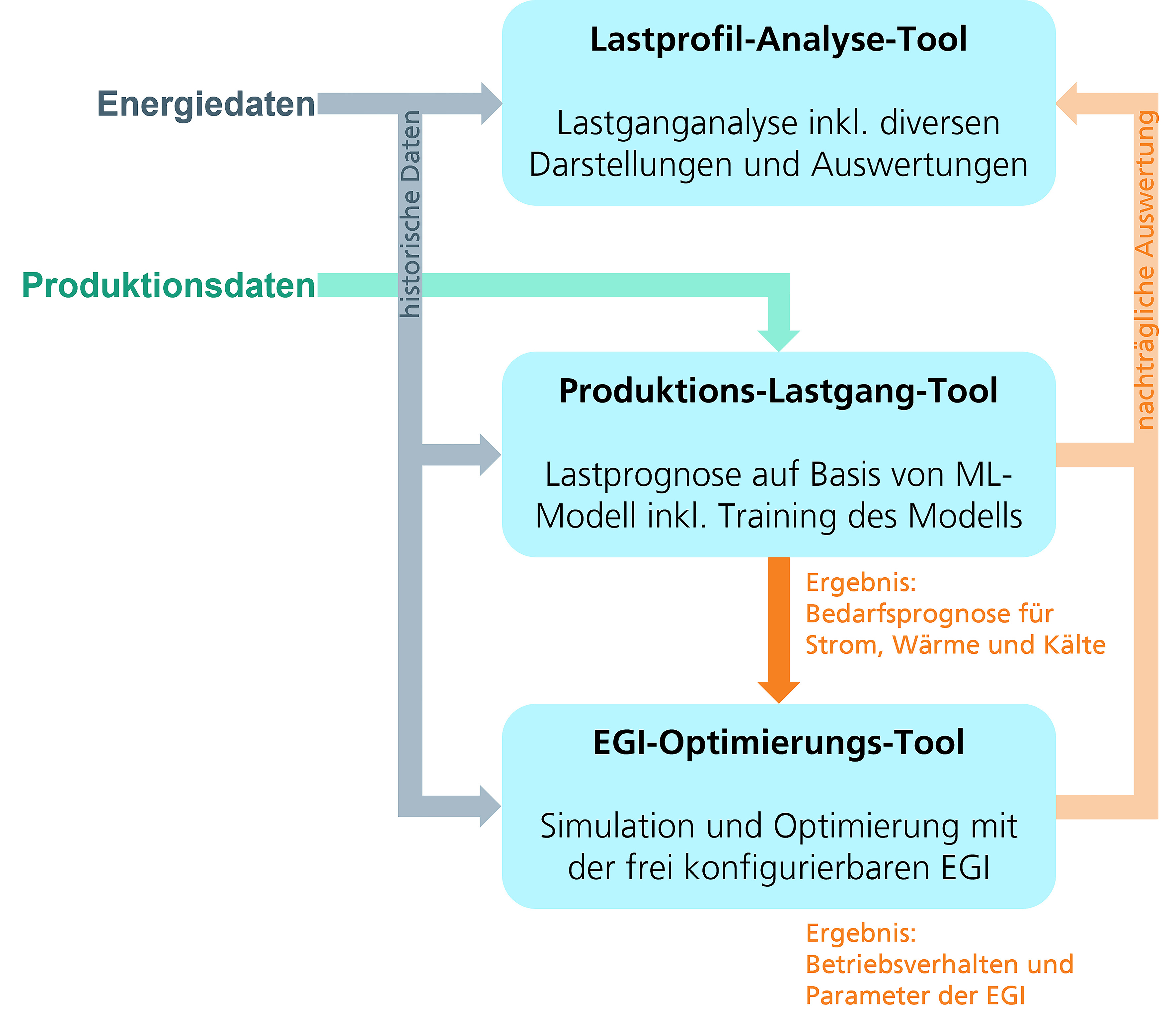 Zur Planung und Optimierung der energetischen Gebäudeinfrastruktur von Unternehmen hat das Projektkonsortium von ProEnergie-Bayern eine Software-Toolbox entwickelt. Sie beinhaltet drei Tools, die Energiedaten analysieren, Energiebedarfe voraussagen und darauf basierend individuelle Optimierungsschritte entwickeln. Unternehmen sparen durch die Anpassung ihrer Energiebereitstellung Kosten ein und reduzieren gleichzeitig ihre CO2-Emissionen. Die Toolbox wird der Öffentlichkeit Anfang 2023, nach Beendigung des Projekts, auf der Website www.proenergie-bayern.de kostenlos zur Verfügung gestellt.