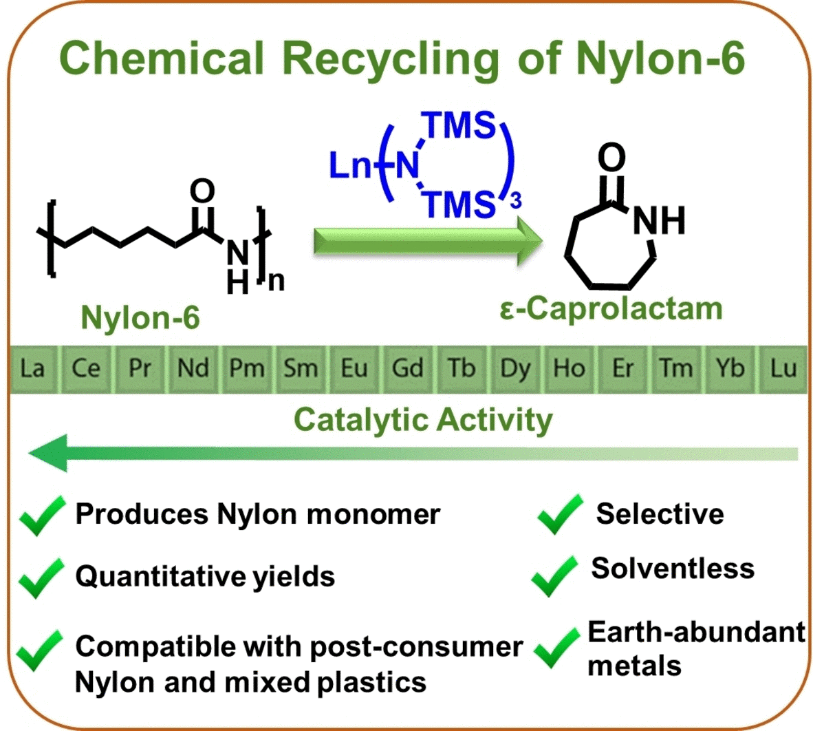 Das Team um Yosi Kratish und Tobin J. Marks von der Northwestern University (Evanston, USA) und dem National Renewable Energy Laboratory (Golden, USA) hat jetzt einen neuen effizienten katalytischen Prozess zum Recycling von Nylon-6 entwickelt. Nylon-6 wird mit mehr als 95% Selektivität und mehr als 90% Ausbeute zu ε-Caprolactam depolymerisiert – ohne Lösungsmittel oder toxische Chemikalien und bei vergleichsweise milden Temperaturen von 240 °C. Beimischungen von Polyethylen, Polypropylen oder Polyethylenterephthalat stören nicht.