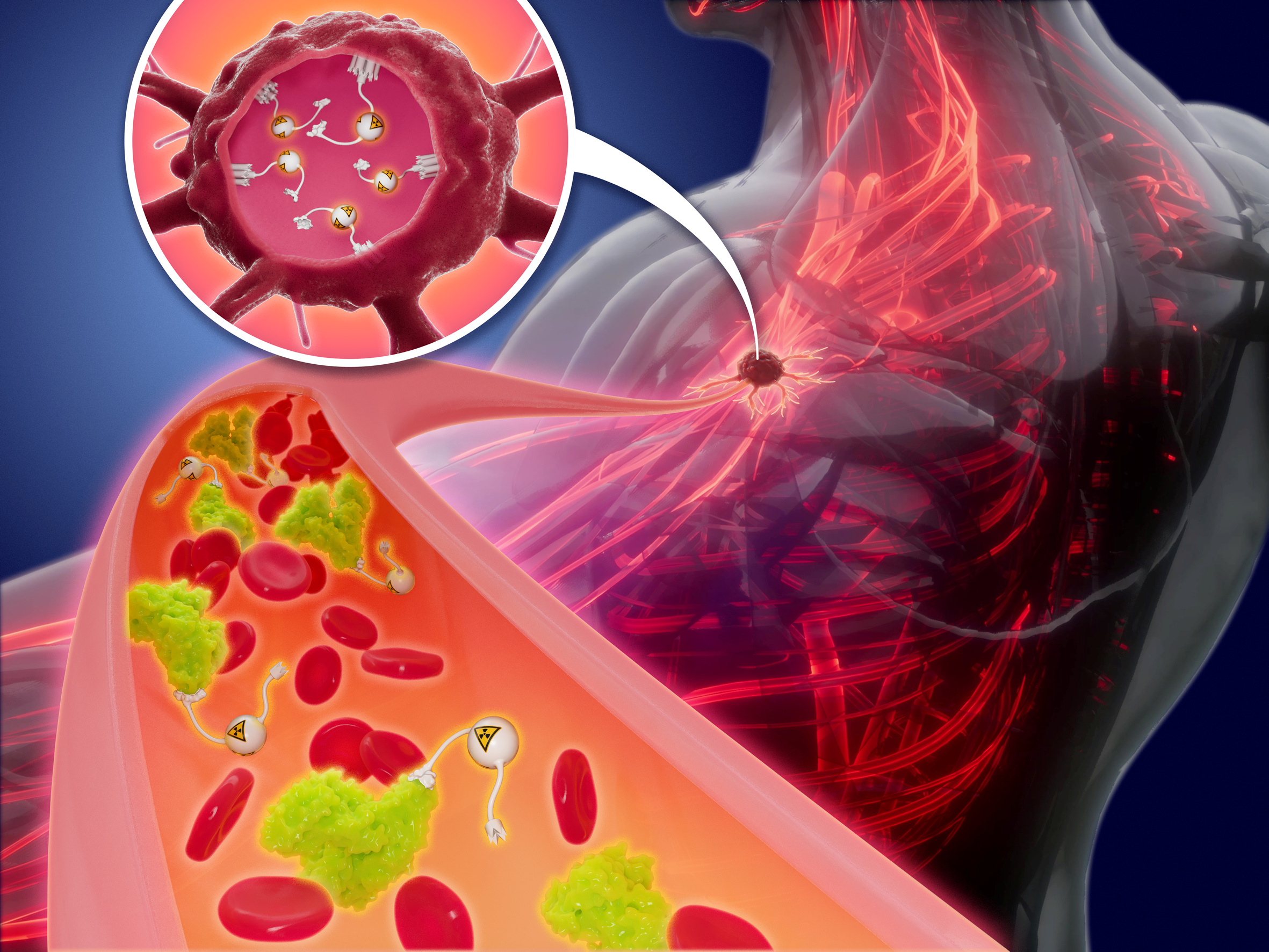 In einer jetzt im Fachmagazin „Theranostics“ veröffentlichten Studie setzten die Forscher auf eine zusätzliche Bindungsstelle für ihr bereits zuvor entwickeltes Radiokonjugat. Die Idee: Das Biomolekül bindet an das häufigste Protein im Blutplasma, das Albumin. Durch diese Anbindung vergrößert sich der Molekülkomplex, die Nieren können ihn nicht so schnell aus dem Blut herausfiltern und die Dauer, im Blut zu verbleiben, steigt an.