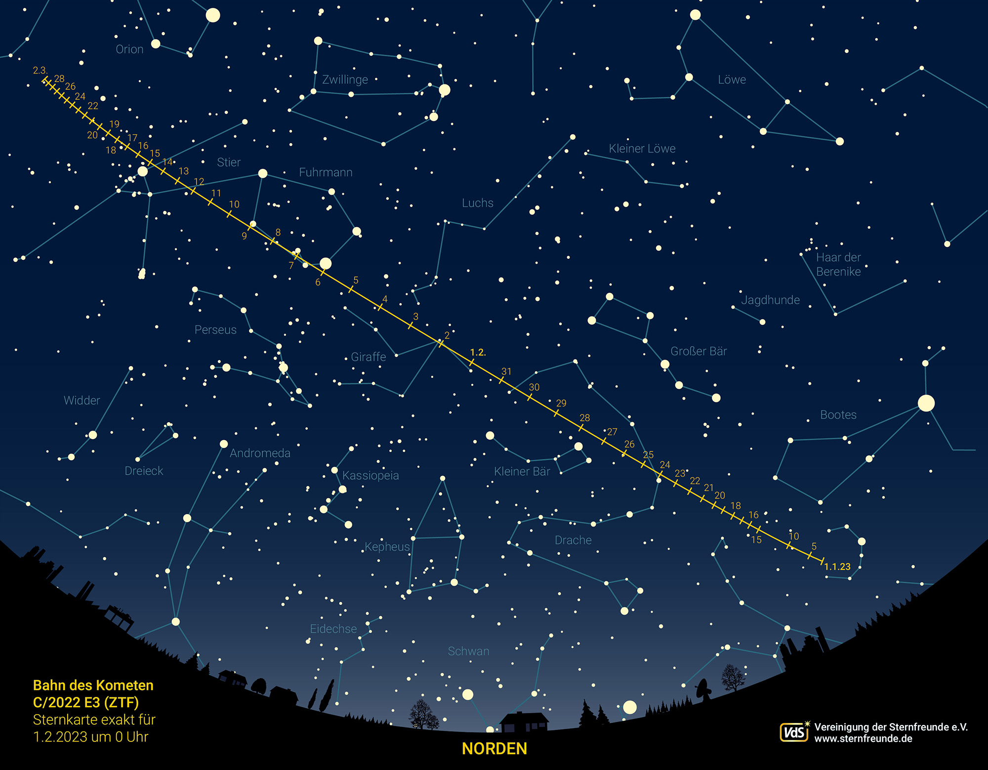 Gemeinsame Pressemitteilung der Vereinigung der Sternfreunde (VdS) und des Hauses der Astronomie in Heidelberg - Das neue Jahr bietet uns gleich ein interessantes Himmelsschauspiel: der Komet C/2022 E3 (ZTF) wird Anfang Februar mit ca. 5,5 mag seine maximale Helligkeit erreichen und gut mit dem Fernglas zu beobachten sein. Er ist zunächst ein Objekt des Morgenhimmels, wird dann nahe des Polarsterns die gesamte Nacht über hoch am Himmel stehen und verabschiedet sich Anfang März am Abendhimmel.