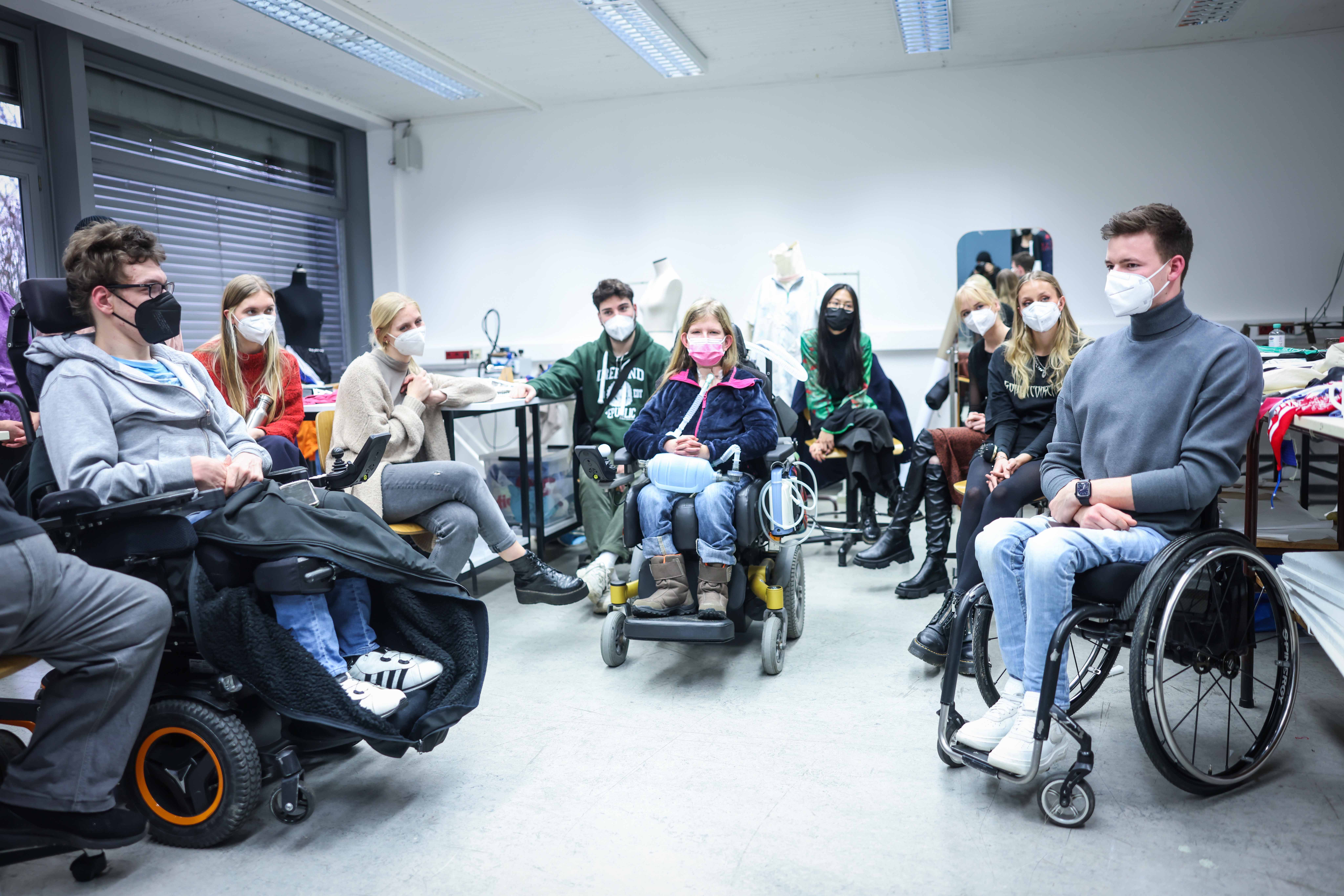 Mit einer Software konnte Isabel Niemann ihre Schnitte zunächst an digitalen, sitzenden Avataren virtuell anprobieren. Jetzt kamen Klara Kampmann, Josephine Otto, Till Keller und Kai Kramer auch für die erste „richtige“ Anprobe am Fachbereich Gestaltung vorbei. Für Josephine Otto entwarf Isabel Niemann einen Rollkragenpullover mit einer Aussparung für ihren Beatmungsschlauch. „Ich kann nicht einfach in einen Laden gehen und mir einen Pullover aussuchen“, erklärt Josephine Otto. Ergänzt wird das Oberteil durch austauschbare und leicht zu reinigende Stoffadapter, die um die Öffnung am Hals gelegt werden. „Toll wäre noch eine Abdeckung für mein Beatmungsgerät, das darf nämlich nicht nass werden. Fertig zu kaufen gibt es sowas nicht“, sagt Josephine Otto. Isabel Niemann nickt und macht sich Notizen.