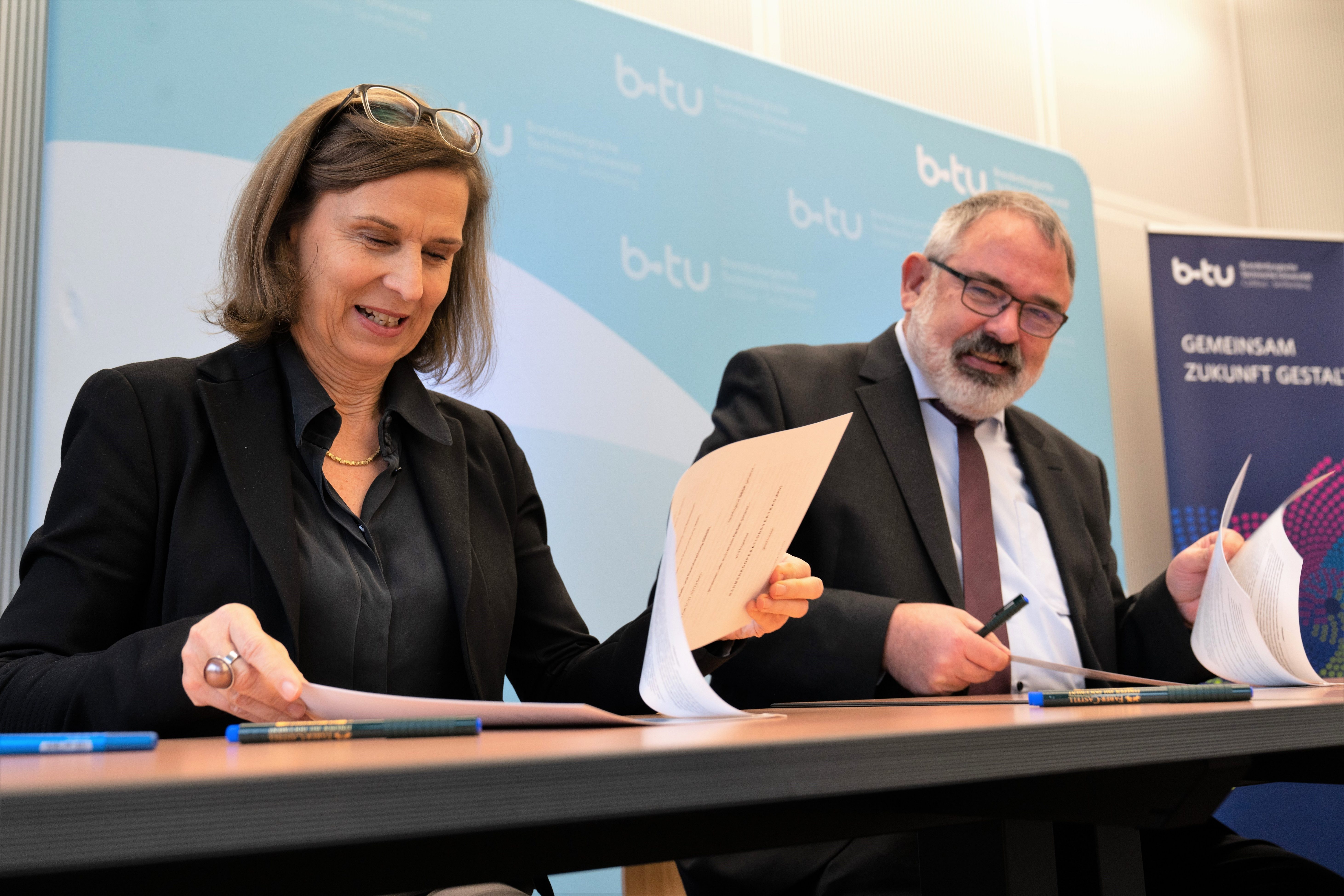 Neben Prof. Dr. Grande und Dr. Markus Eltges unterschrieben Dekan Prof. Dr. Bernhard Weyrauch für die BTU-Fakultät Architektur, Bauingenieurwesen und Stadtplanung, Prof. Dr. David Müller, Dekan der Fakultät für Wirtschaft, Recht und Gesellschaft, sowie die Leiterin des Informations-, Kommunikations- und Medienzentrums (IKMZ), Dr. Claudia Börner, die Vereinbarung.