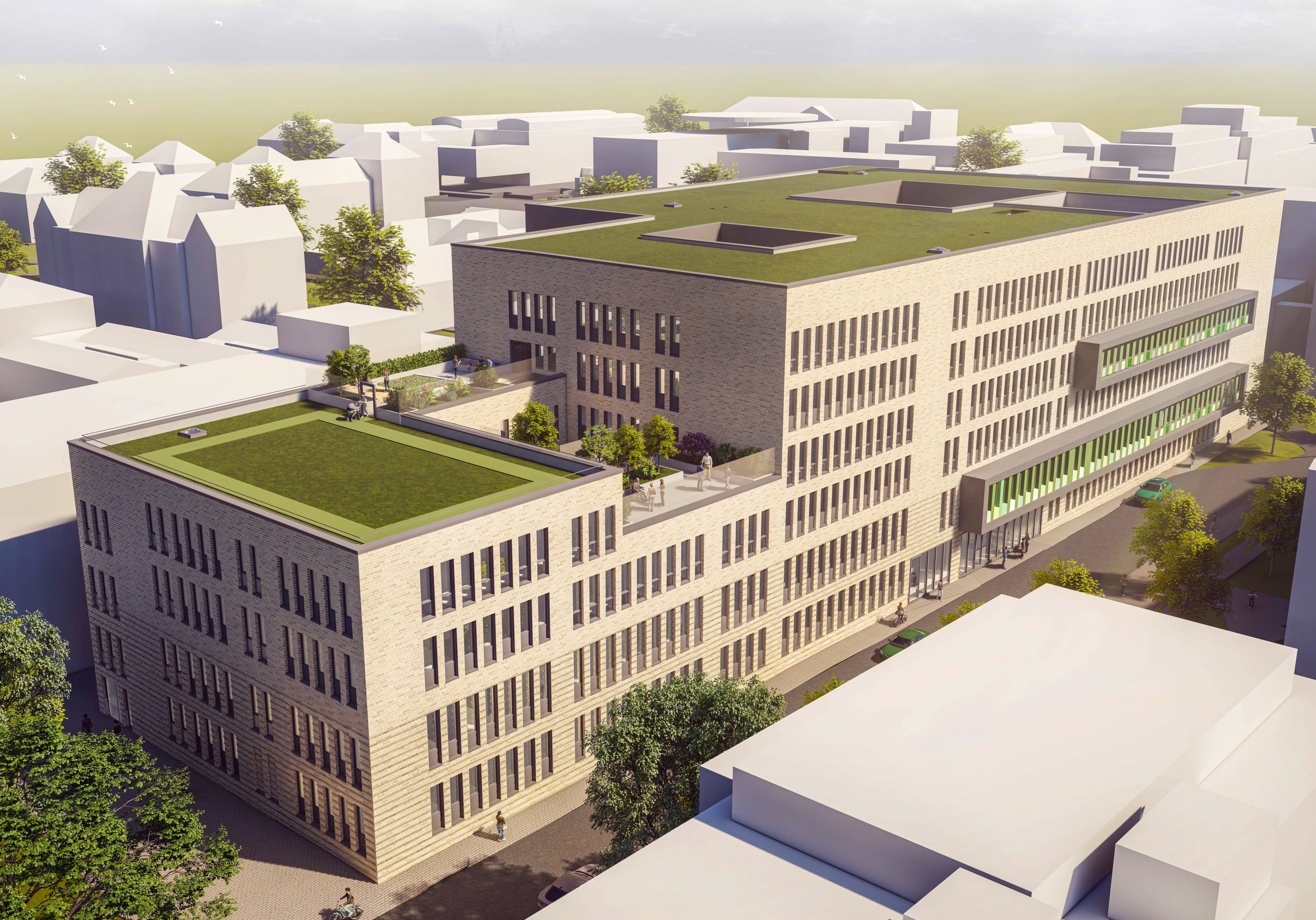 Auch bei diesem Neubau auf dem Klinikumsgelände zahlt sich die enge Zusammenarbeit der Planer mit den künftigen Nutzern des Gebäudes aus. Beispiele für eine entsprechend angepasste Architektur gibt es einige. Der Zentrumsneubau ist auf die Bedürfnisse der Kranken sowie der pflegerisch und ärztlich sowie psychologisch Tätigen ausgerichtet. Ein adäquater Grundriss mit einer entsprechenden Gestaltung wirkt sich unmittelbar auf das Befinden der Menschen aus und befördert so den Genesungsprozess der seelisch Erkrankten. Auch bei den geriatrischen Patientinnen und Patienten, die beispielsweise nach einem Unfall stationär aufgenommen werden müssen, wird der Neubau dazu beitragen, dass sich die physischen Leiden so gering wie möglich auf den seelischen Zustand auswirken. Ein Beispiel dafür sind die Gänge und Flure auf der geriatrischen Station: Sie sind so angelegt, dass keine Sackgassen entstehen. Das hilft den Patientinnen und Patienten mit Demenzerkrankungen bei der Orientierung. In den Fluren werden zudem an breiteren Stellen und an Türen Sitzmöglichkeiten eingeplant. Damit die Patientinnen und Patienten des Zentrums Erholung und Ausgleich an der frischen Luft und im Grünen finden, haben die Architekten in ihrem Entwurf spezielle nach oben größer werdende Innenhöfe mit Terrassen vorgesehen. Zusätzlich bietet der Neubau zwei Dachgärten und einzelne Loggien. Auch weitere bauliche Details sind architektonisch besonders. So kann beispielsweise die zweigeschossige Eingangshalle als Verbindungsweg von der Hauptachse bis zur Fiedlerstraße genutzt werden.