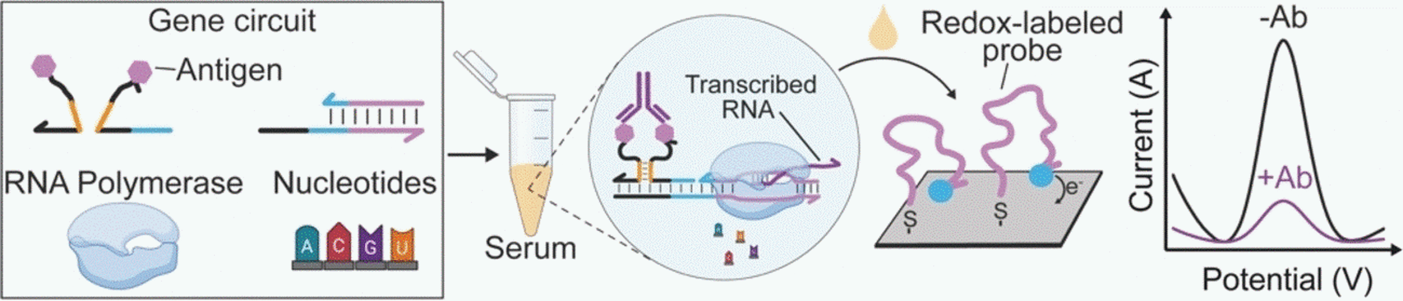 Dazu entwarf das Team ein synthetisches Gen mit einem unvollständigen Promoter. Der Promoter ist ein DNA-Abschnitt, der das Ablesen eines Gens steuert. Ist der Promoter unvollständig, kann die RNA-Polymerase die Transkription der RNA nicht starten. Die Testlösung enthält ein Paar synthetischer DNA-Stränge, die an ein Protein-Segment (ein Peptid) gebunden sind, das spezifisch von Anti-Grippe-Antikörpern erkannt wird. Bindet der Antikörper das Peptid, ordnen sich die beiden DNA-Stränge so an, dass sie den Promoter vervollständigen und das synthetische Gen anschalten. Die RNA-Polymerase kann nun an das synthetische Gen andocken und mit der Transkription von RNA-Strängen beginnen. Diese RNA-Stränge binden dann spezifisch an eine auf einer kleinen Einmal-Elektrode fixierte DNA-Sonde und ändern deren Stromsignal messbar. Solange keine Antikörper anwesend sind, wird keine RNA transkribiert und keine Änderung des Stromsignals wird von der Einmal-Elektrode gemessen. Enthält die Probe Anti-Grippe-Antikörper, synthetisiert die Maschinerie RNA, die an die Elektrode bindet und das Stromsignal ändert.