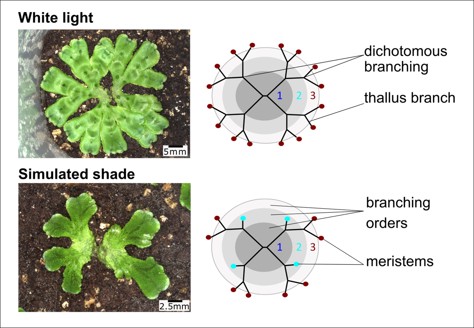 Die ForscherInnen stellten die Hypothese auf, dass Lebermoose, die nicht zu den Gefäßpflanzen gehören und vermutlich den frühesten Landpflanzen ähneln, ebenfalls über einen Mechanismus verfügen, um ihr Verzweigungsmuster an wechselnde Lichtverhältnisse anzupassen. Wie Gefäßpflanzen haben sie Meristeme und sind zur Verzweigung fähig. Im Gegensatz zu den Gefäßpflanzen, die sich unterhalb der Spitze oder des Scheitelpunkts seitlich verzweigen, verzweigen sich die Moose jedoch nur am Scheitelpunkt in einem Mechanismus, der dichotome Verzweigung genannt wird.