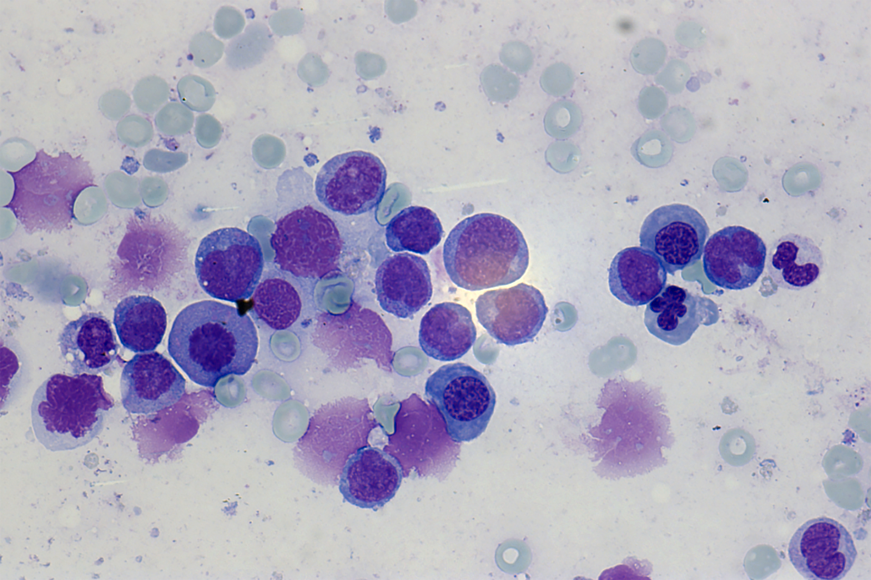 Bildunterschrift: Bei der AML entartet eine frühe Vorstufe der sogenannten myeloischen Zellen, diese sogenannten Blasten (violett eingefärbt, 63-fache Vergrößerung) vermehren sich in der Folge unkontrolliert.