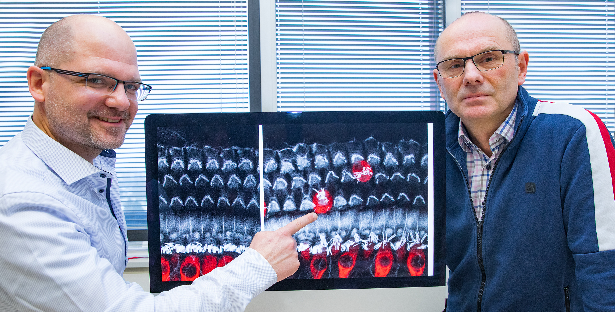 Weltweit sind mehr als 400 Millionen Menschen von Schwerhörigkeit betroffen. Am häufigsten ist die Schallempfindungsschwerhörigkeit, bei der die für das Hören zuständigen Haarzellen zerstört werden. Von Geburt an besitzen wir etwa 15.000 Haarzellen in jedem Ohr. Sie liegen im Innenohr in der Gehörschnecke, in der Fachsprache Cochlea genannt. 3500 davon gehören zu den inneren Haarzellen. Sie sind die eigentlichen Sinneszellen und wandeln die durch äußeren Schall ausgelösten Schwingungen im Innenohr in elektrische Signale um. Diese gelangen über Nervenbahnen ins Gehirn, wo der Höreindruck entsteht. Die äußeren Haarzellen wirken als mechanischer Verstärker und verbessern die Empfindlichkeit des Gehörs. Einmal zerstört, können sich die Haarzellen nicht mehr regenerieren und das Hörvermögen nimmt ab. „Das geschieht beispielsweise durch Alterungsprozesse, übergroßen Lärm oder auch die Einnahme bestimmter Medikamente“, sagt Dr. Trowe, Leiter der Studie. Weltweit arbeitet die Wissenschaft daran, Therapien zu entwickeln, mit deren Hilfe sich die Hörsinneszellen erneuern lassen. „Doch dafür ist es zwingend notwendig zu verstehen, welche Gene die Bildung der Haarzellen in der Embryonalentwicklung kontrollieren“, betont der Molekularbiologe.