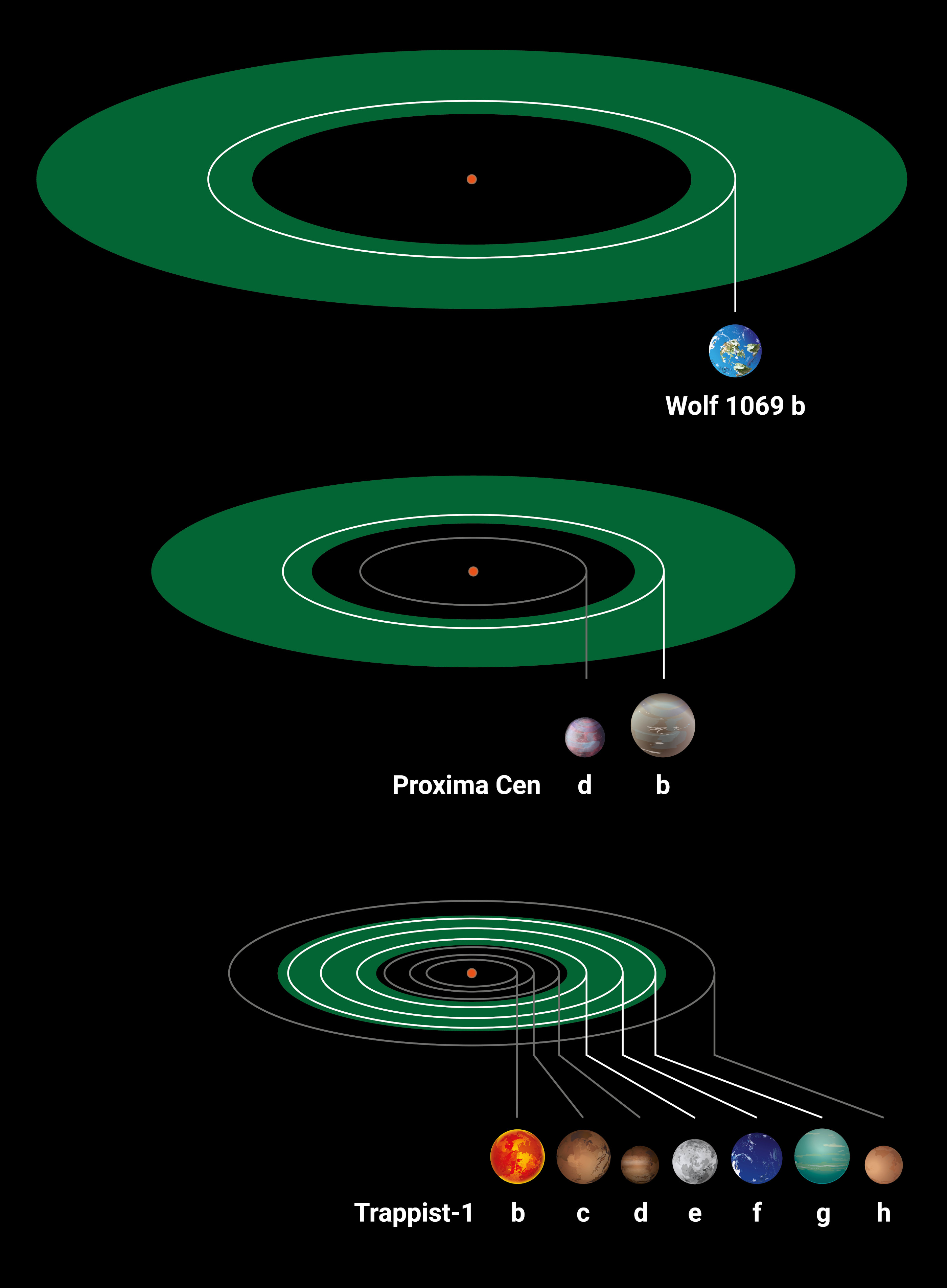 Trotz der geringen Entfernung empfängt Wolf 1069 b nur etwa 65 % der Strahlungsleistung, die die Erde von der Sonne erhält. Im Vergleich zur Sonne sendet Wolf 1069 viel weniger Strahlung aus, und seine Oberfläche ist kühler, was den Stern orange erscheinen lässt. Diese Eigenschaften führen zu einer geringeren Heizleistung. „Dadurch verschiebt sich die sogenannte habitable Zone nach innen“, erläutert Kossakowski. Deshalb können Planeten um rote Zwergsterne wie Wolf 1069 lebensfreundlich sein, obwohl sie viel näher sind als die Erde an der Sonne. Mitautor Jonas Kemmer von der Universität Heidelberg fügt hinzu: „Das CARMENES-Instrument wurde genau zu dem Zweck gebaut, die Entdeckung möglichst vieler potenziell lebensfreundlicher Welten zu erleichtern.“
