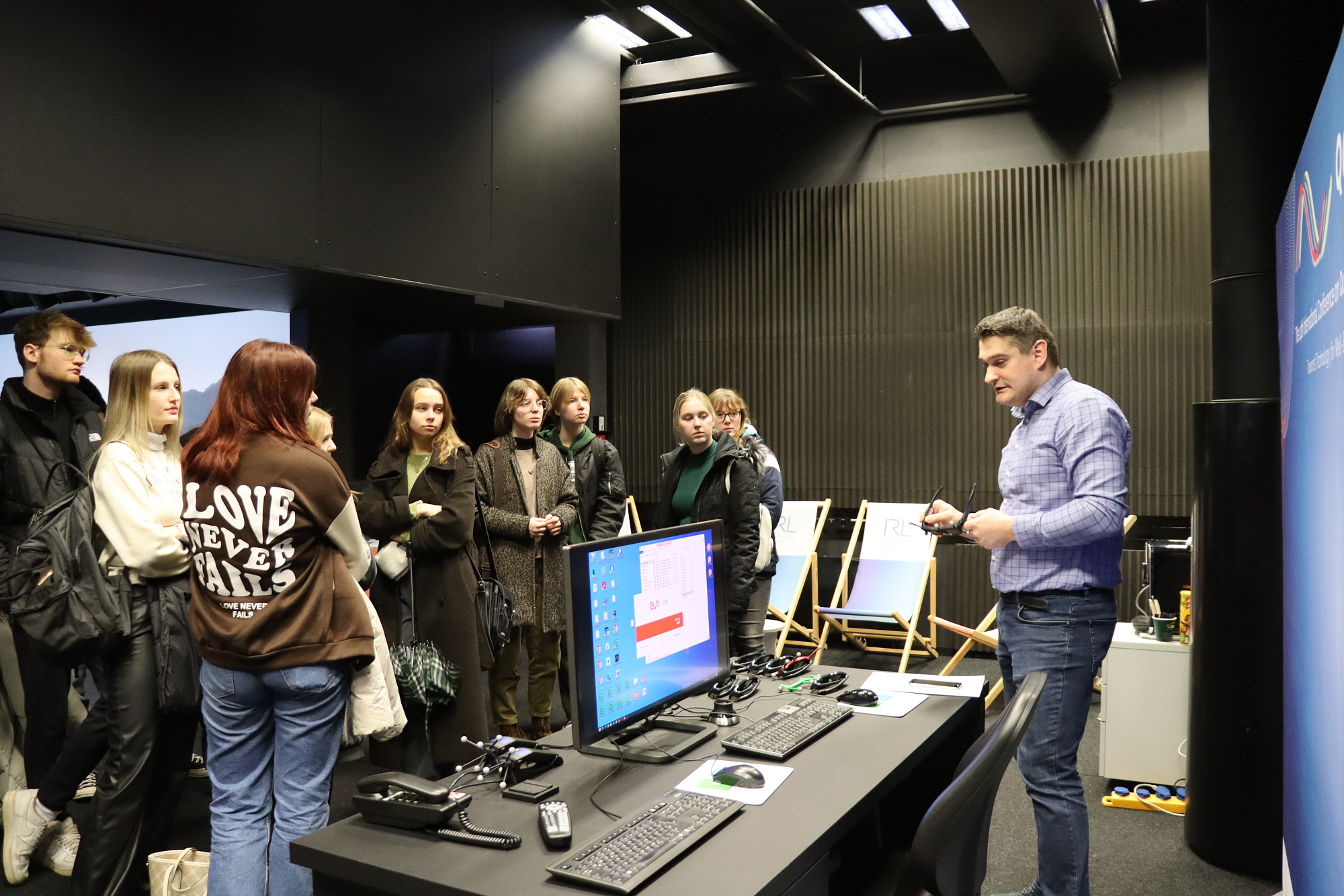 Ein Highlight war der Besuch der Scheinwerfer-Leuchtenmessstrecke, wo die Schülerinnen und Schüler aus der Oberstufe der Gesamtschule Verl den Forschungsbereich Photonik, Optik und Lichttechnik der HSHL kennenlernen konnten. Außerdem ging es in die sogenannte Cave. "Cave" steht für "Cave Automatic Virtual Environment" und meint einen Raum, in dem hochauflösende Bilder auf Wände, Boden und ggf. sogar eine Decke aus Acrylglas projiziert werden. Die Schülerinnen und Schüler konnten hier virtuelle Realität hautnah erleben.