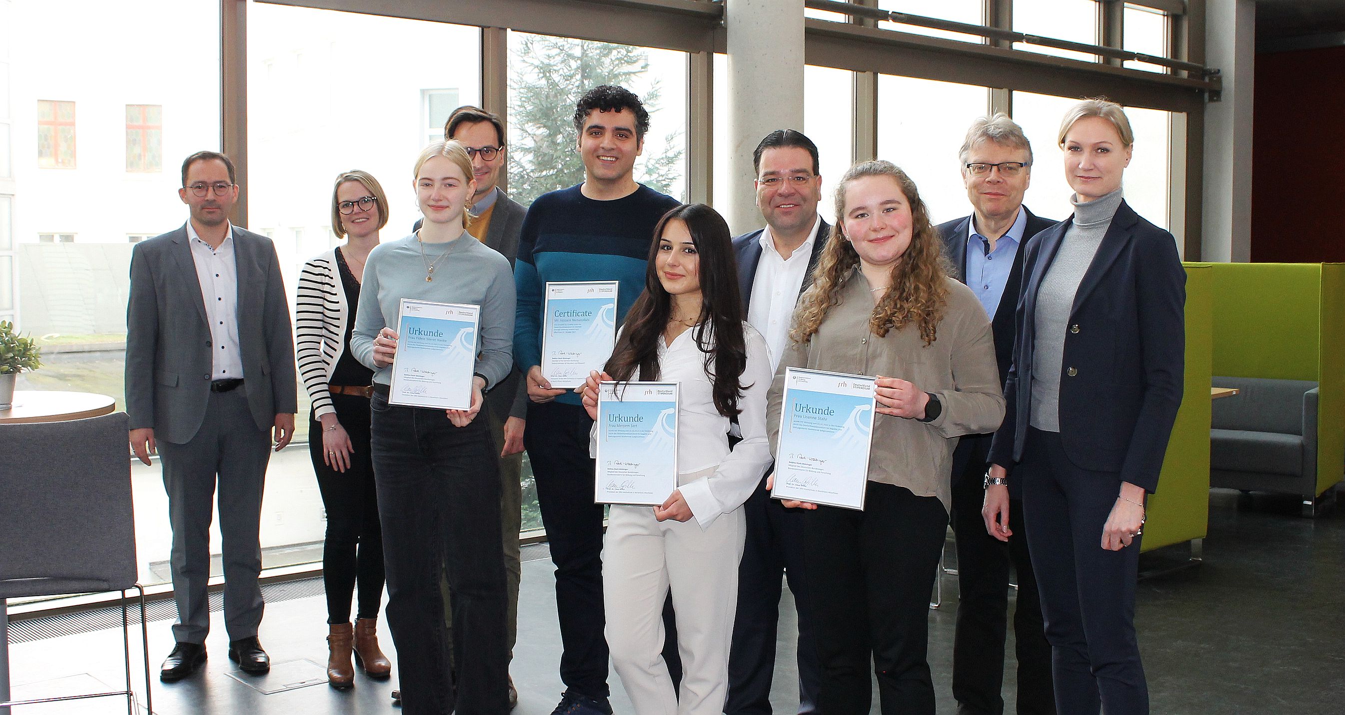 Meryem Sert, Studierende des Bachelor-Studiengangs Soziale Arbeit im dualen Format, wird von der Dortmunder Volksbank gefördert, Lisanne Stahr, ebenfalls Studierende des Bachelor-Studiengangs Soziale Arbeit dual wird vom Förderverein der Hochschule, dem ERANUS e.V., finanziell unterstützt und Fidele Hanke, Studierende des Bachelor-Studiengangs Psychologie, bekommt ihre monatliche Förderung von der Sparkasse Hamm. Wie bereits im vergangenen Jahr wurde auch in diesem Jahr wieder ein Deutschland-Stipendium im Rahmen des ALLStay-Projekts der Hochschule vergeben. Hier übernahm ebenfalls der ERANUS e.V. die Förderung von Hossein Nematollahi, Masterstudent des englischsprachigen Studiengangs Master of International Business and Engineering M.Eng..