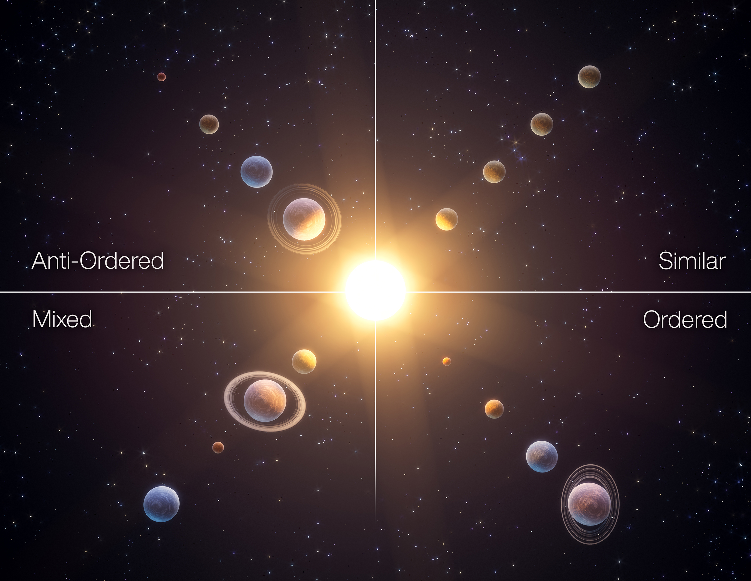 «Wir bezeichnen diese vier Klassen als ‘ähnlich’, ‘geordnet’, ‘anti-geordnet’ und ‘gemischt’, so Mishra. Planetensysteme, bei denen die Massen der benachbarten Planeten einander ähnlich sind, haben eine ähnliche Architektur. Geordnete Planetensysteme sind solche, bei denen die Masse der Planeten tendenziell mit dem Abstand zum Stern zunimmt – so, wie auch in unserem Sonnensystem. Wenn die Masse der Planeten dagegen mit dem Abstand zum Stern abnimmt, sprechen die Forschenden von einer anti-geordneten Architektur des Systems. Und gemischte Architekturen treten auf, wenn die Planetenmassen in einem System von Planet zu Planet stark schwanken.